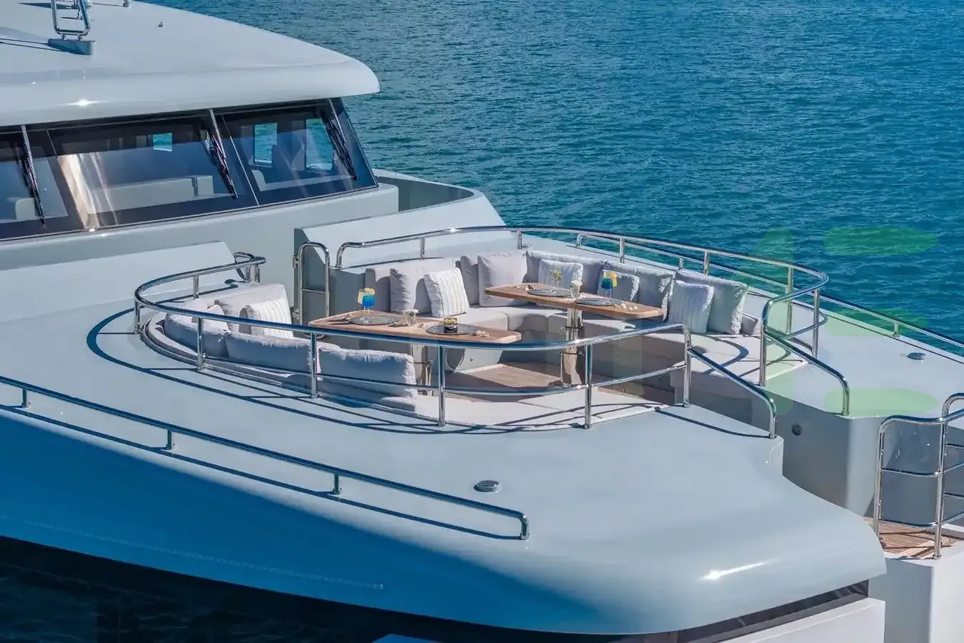 The exterior, designed by Codecasa S.p.A., captures your attention with beautiful lines and impeccable craftsmanship. Whether you're lounging on the spacious decks or enjoying water sports in a secluded anchorage, the GIOIA yacht for charter, built of Steel and Aluminium, offers a wealth of opportunities for relaxation and adventure.