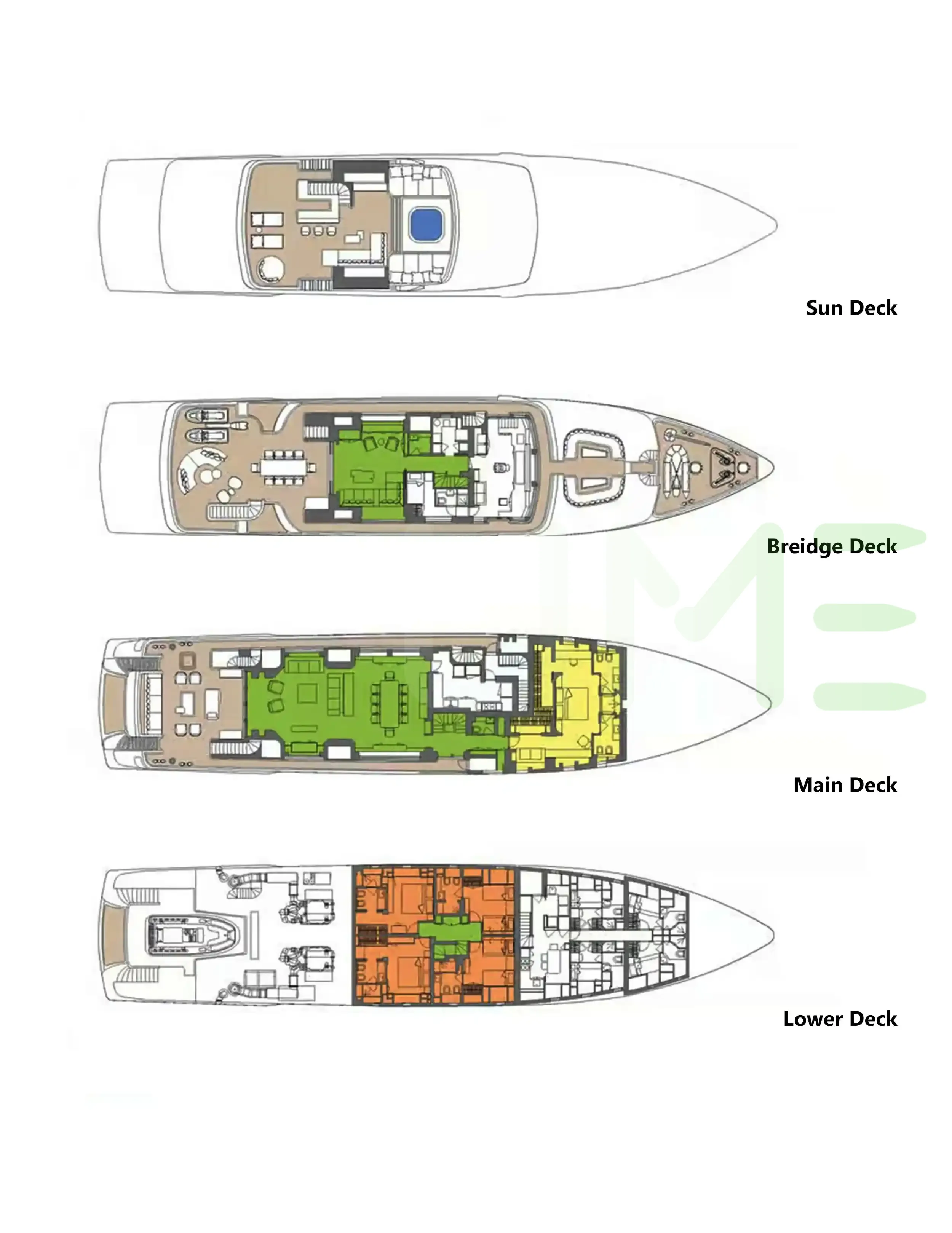 Request plans that include the layout of staterooms, guest areas, and outdoor spaces, as well as crew quarters and work areas.
