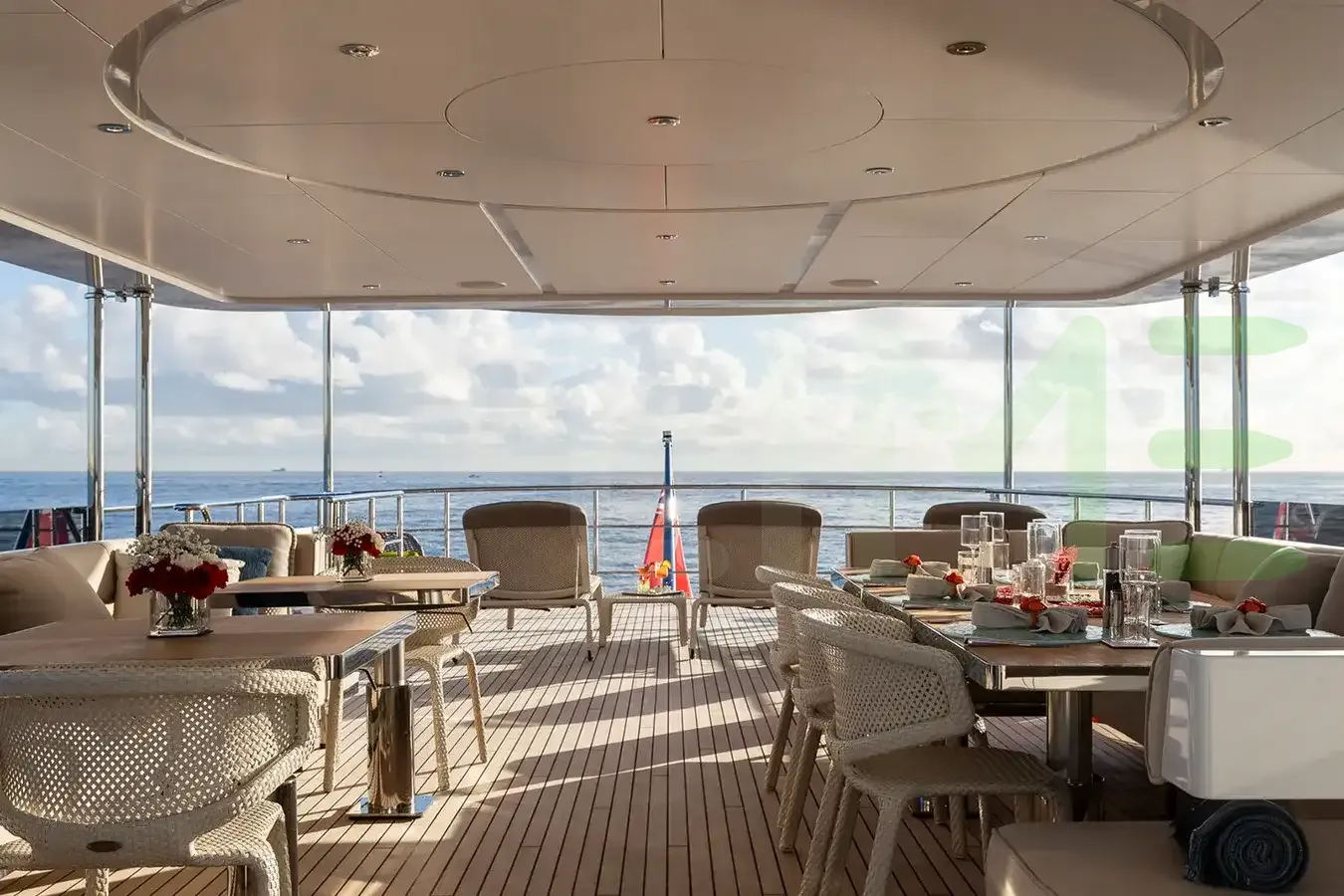 The exterior, designed by De Voogt Naval Architects, captures your attention with beautiful lines and impeccable craftsmanship. Whether you're lounging on the spacious decks or enjoying water sports in a secluded anchorage, the GRAYCLIFFS yacht for charter, built of Aluminium, offers a wealth of opportunities for relaxation and adventure.