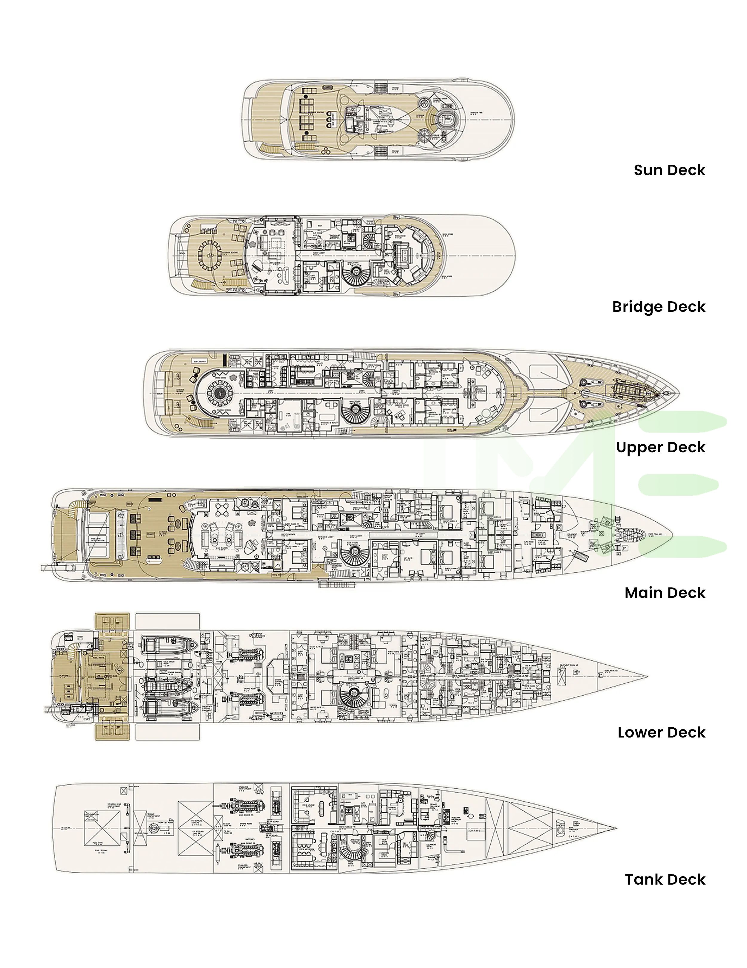 Request plans that include the layout of staterooms, guest areas, and outdoor spaces, as well as crew quarters and work areas.