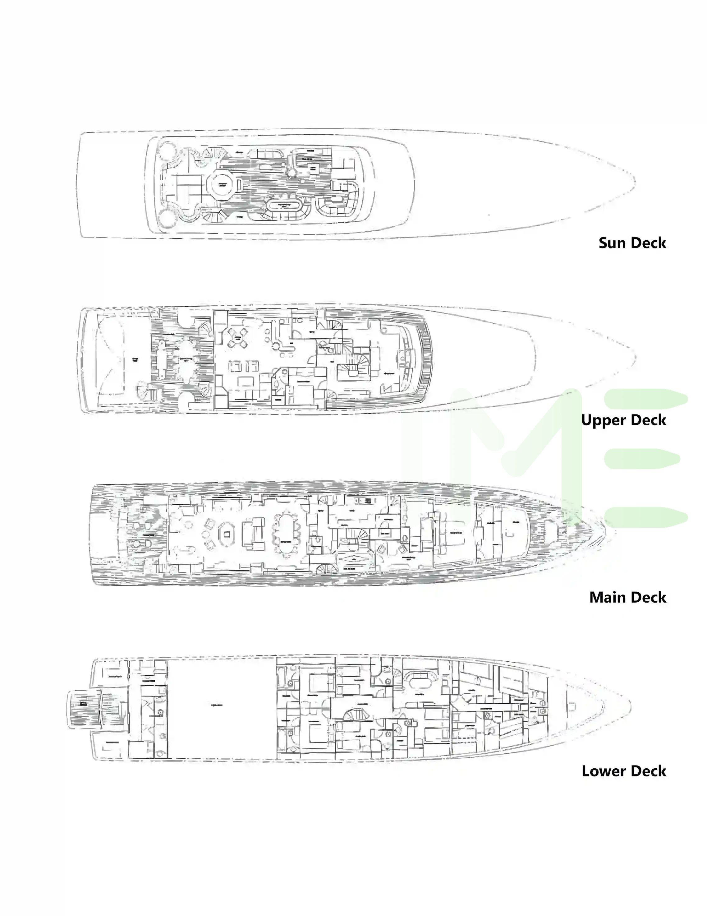 Request plans that include the layout of staterooms, guest areas, and outdoor spaces, as well as crew quarters and work areas.