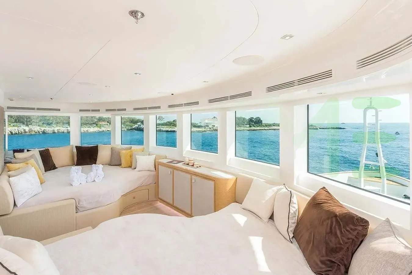 With a gross tonnage of 783, the JADE 959 yacht for charter provides ample interior space for enjoyment. JADE 959 offers accommodations for up to 12 guests in 6 lavishly appointed staterooms. She can also carry up to 10 crew onboard, including the Captain, to ensure a relaxed luxury yacht charter experience. The interior design by Central Yacht, Luxury Projects exudes a sense of luxury, seamlessly blending comfort with style.