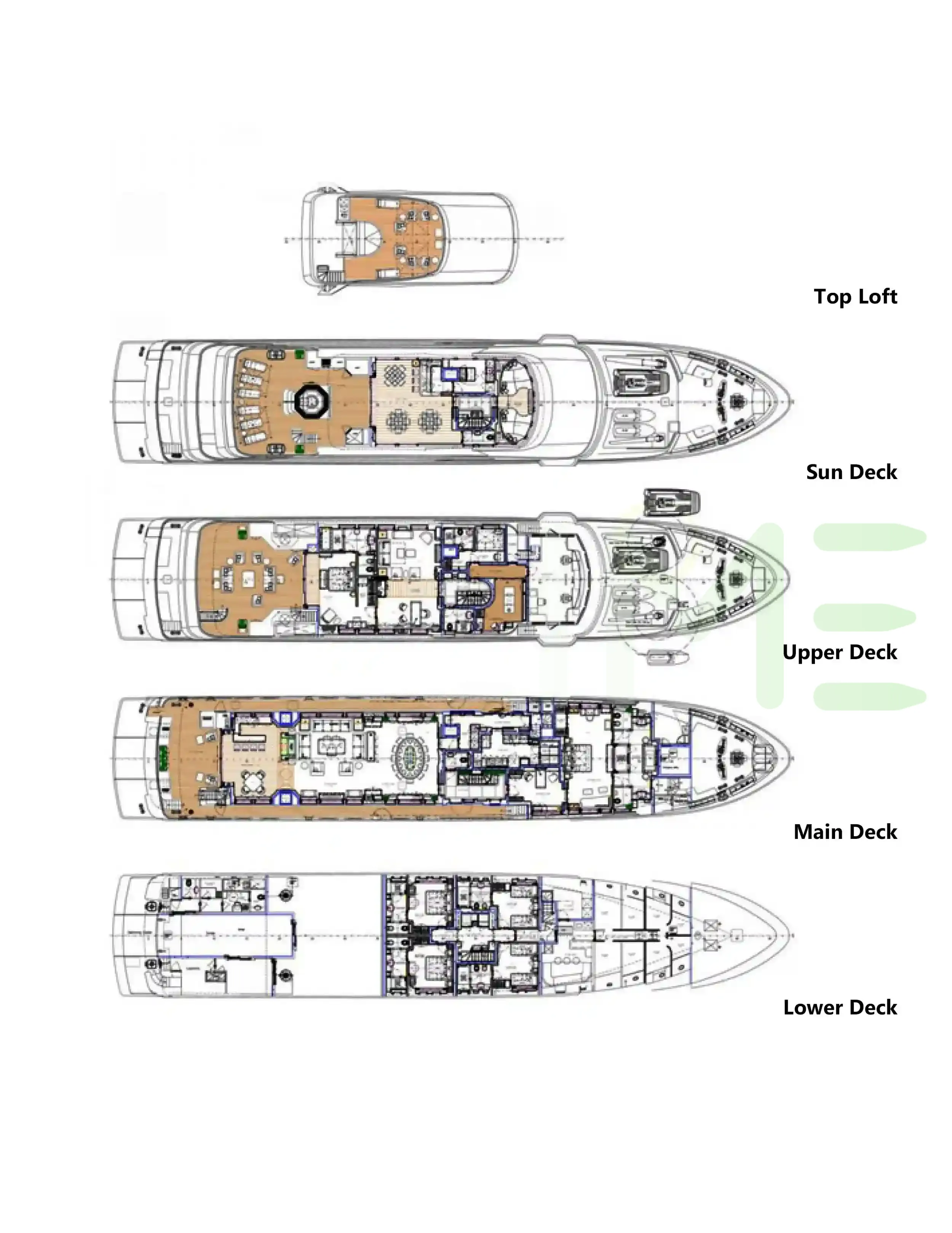 Request plans that include the layout of staterooms, guest areas, and outdoor spaces, as well as crew quarters and work areas.