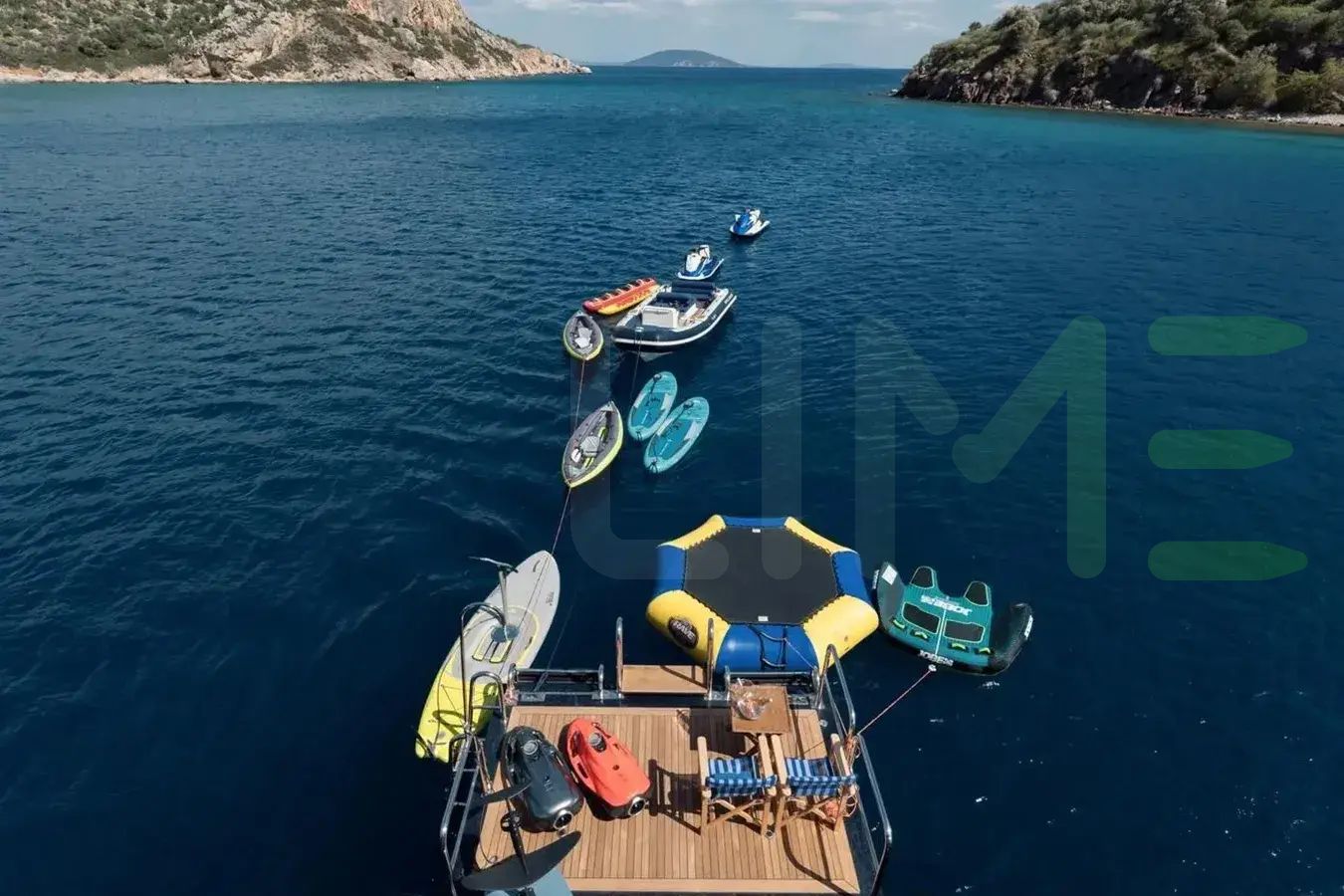 Indulge in the opulent comforts of spacious lounges, gourmet dining areas, and elegantly appointed staterooms. Savor the breathtaking views from the open decks, unwind on a sun lounge, or stay active in the water. For adventure enthusiasts, the JO I motoryacht is equipped with an array of water toys. Dive into the crystal-clear waters for a refreshing swim, explore hidden coves, or experience the thrill of wakeboarding. With attentive crew members catering to your every need, a yacht charter promises an unforgettable blend of relaxation, luxury, and adventure.