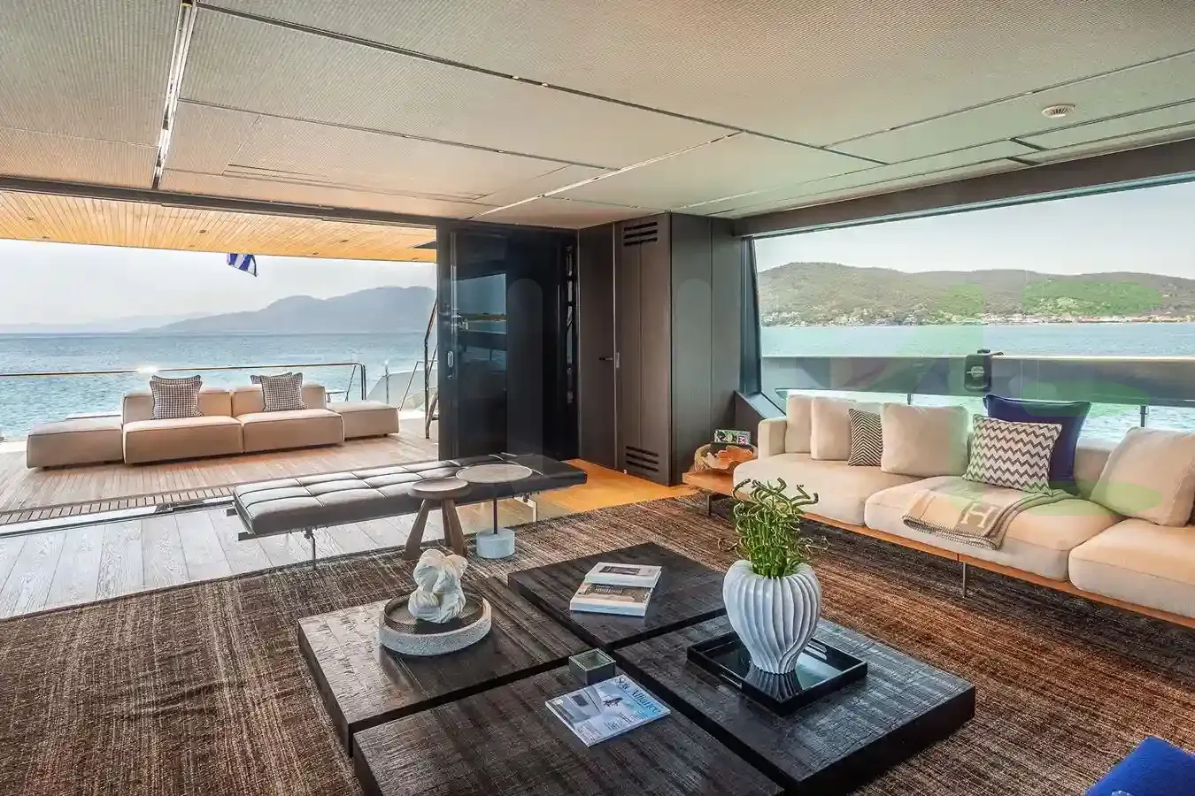 The exterior, designed by Zuccon International Project, captures your attention with beautiful lines and impeccable craftsmanship. Whether you're lounging on the spacious decks or enjoying water sports in a secluded anchorage, the JUST MARIE III yacht for charter, built of GRP, offers a wealth of opportunities for relaxation and adventure.