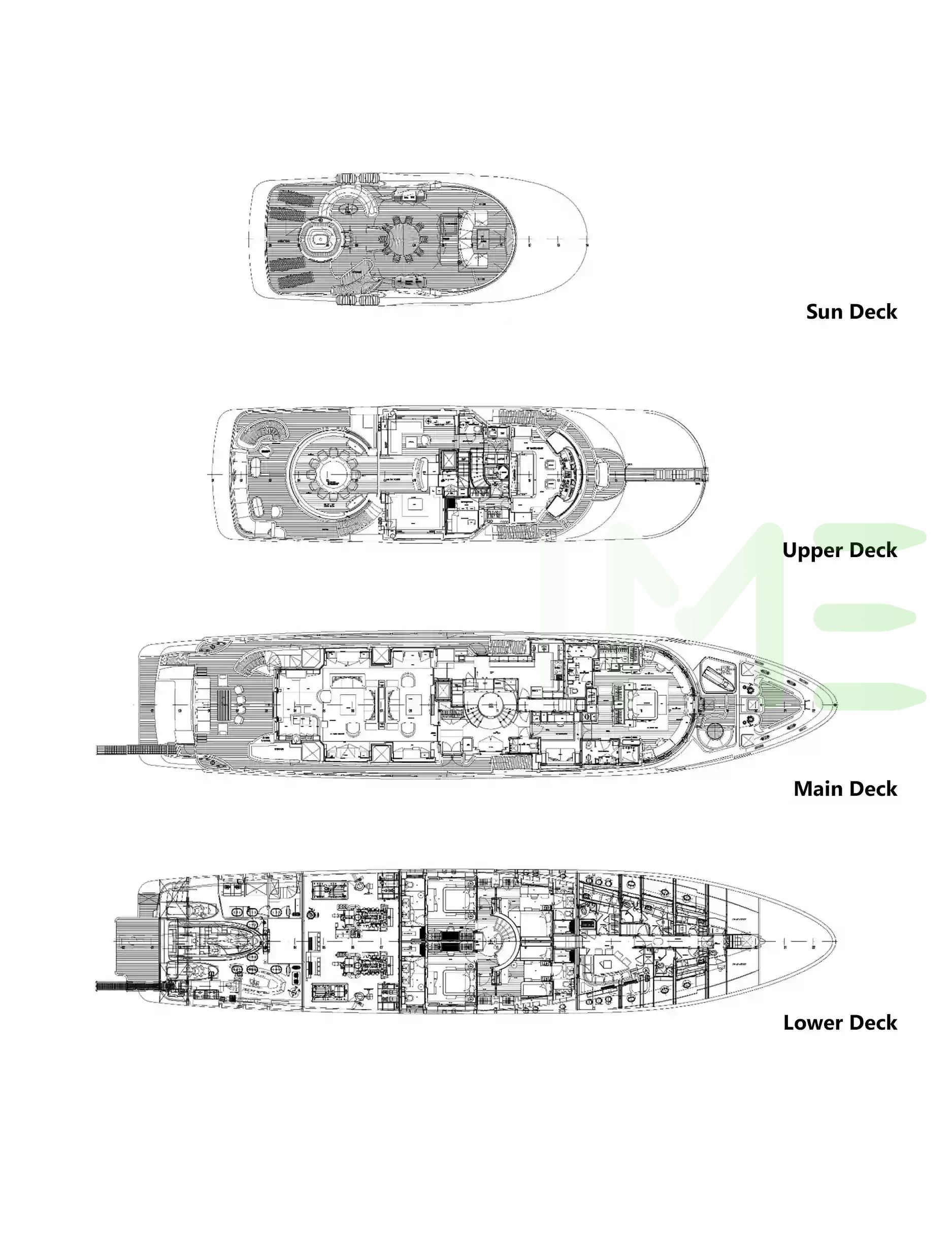 Request plans that include the layout of staterooms, guest areas, and outdoor spaces, as well as crew quarters and work areas.