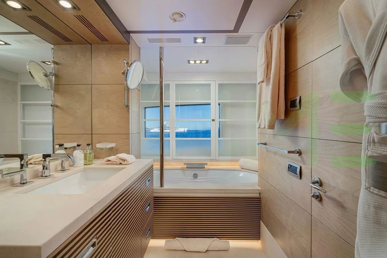 Her features include a gym, deck jacuzzi, WiFi and air conditioning.