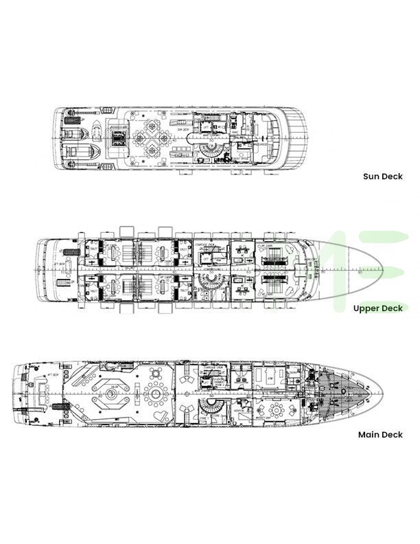 Request plans that include the layout of staterooms, guest areas, and outdoor spaces, as well as crew quarters and work areas.