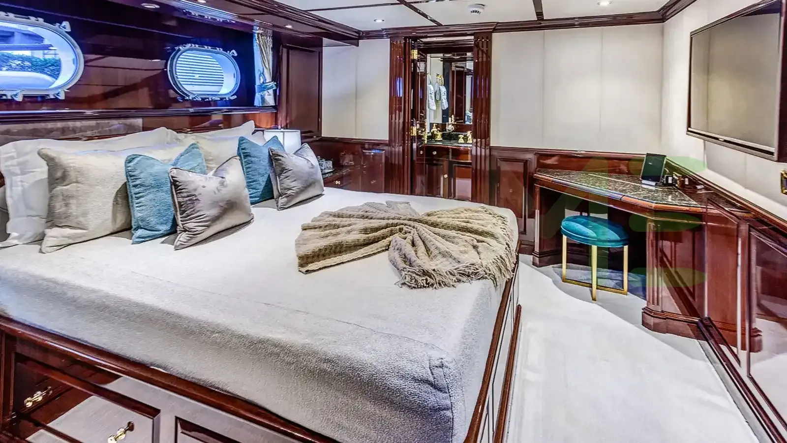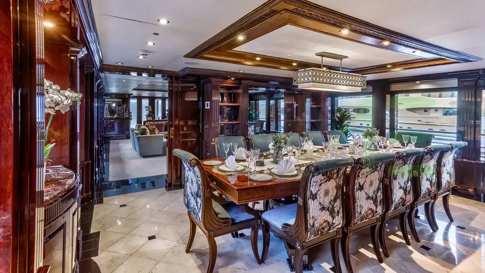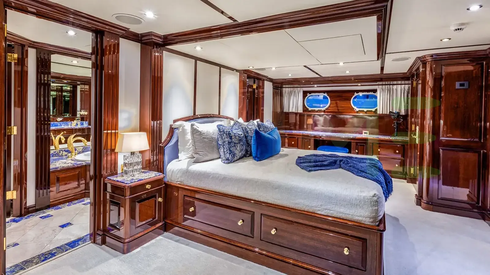 With a gross tonnage of 460, the KEFI yacht for charter provides ample interior space for enjoyment. KEFI offers accommodations for up to 12 guests in 6 lavishly appointed staterooms. She can also carry up to 9 crew onboard, including the Captain, to ensure a relaxed luxury yacht charter experience. The interior design by Donald Starkey Designs exudes a sense of luxury, seamlessly blending comfort with style.