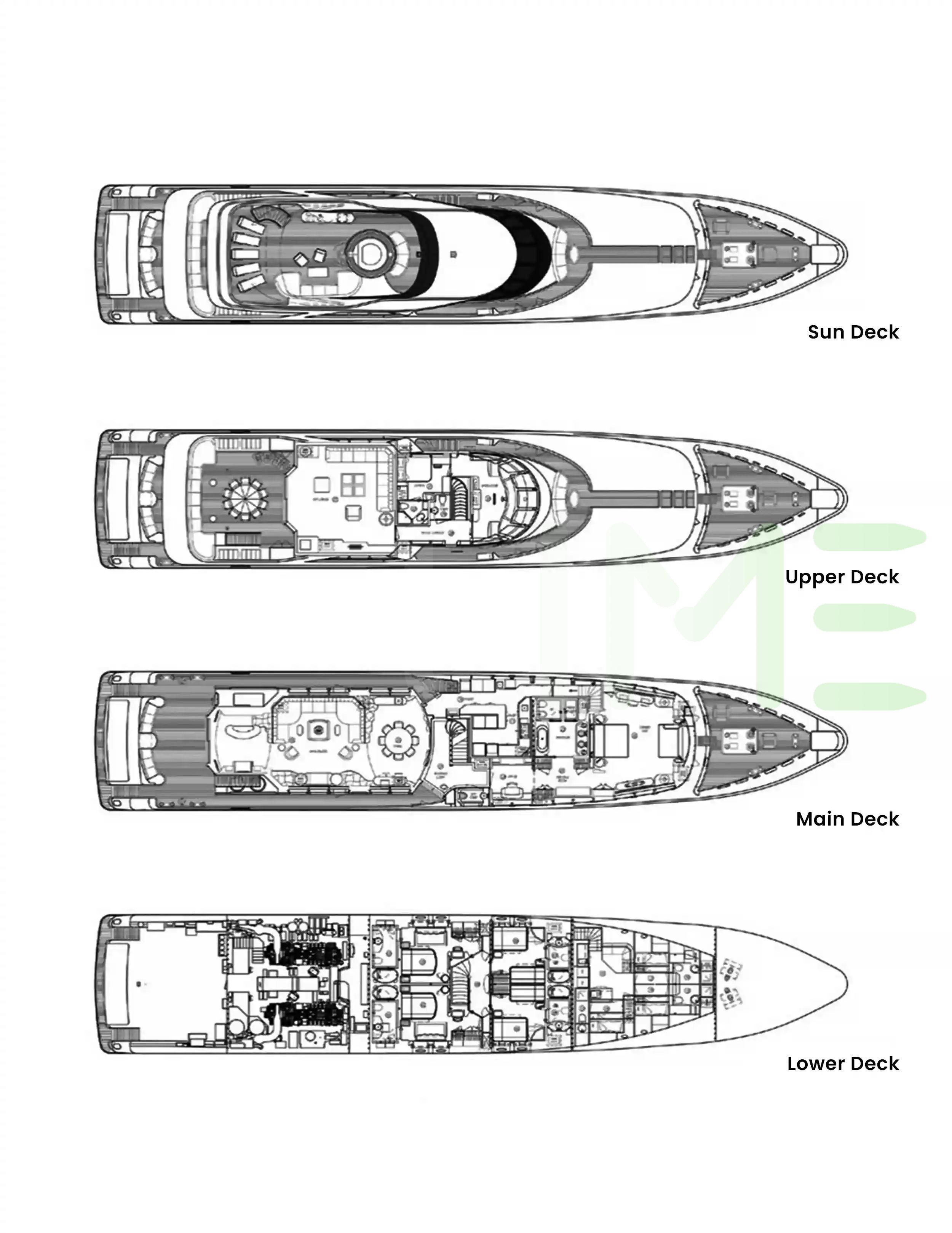 Request plans that include the layout of staterooms, guest areas, and outdoor spaces, as well as crew quarters and work areas.