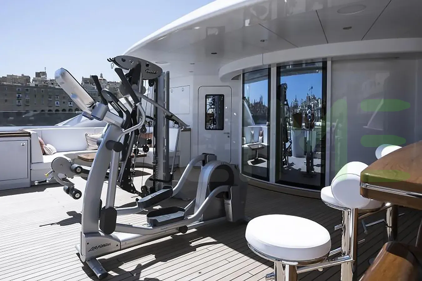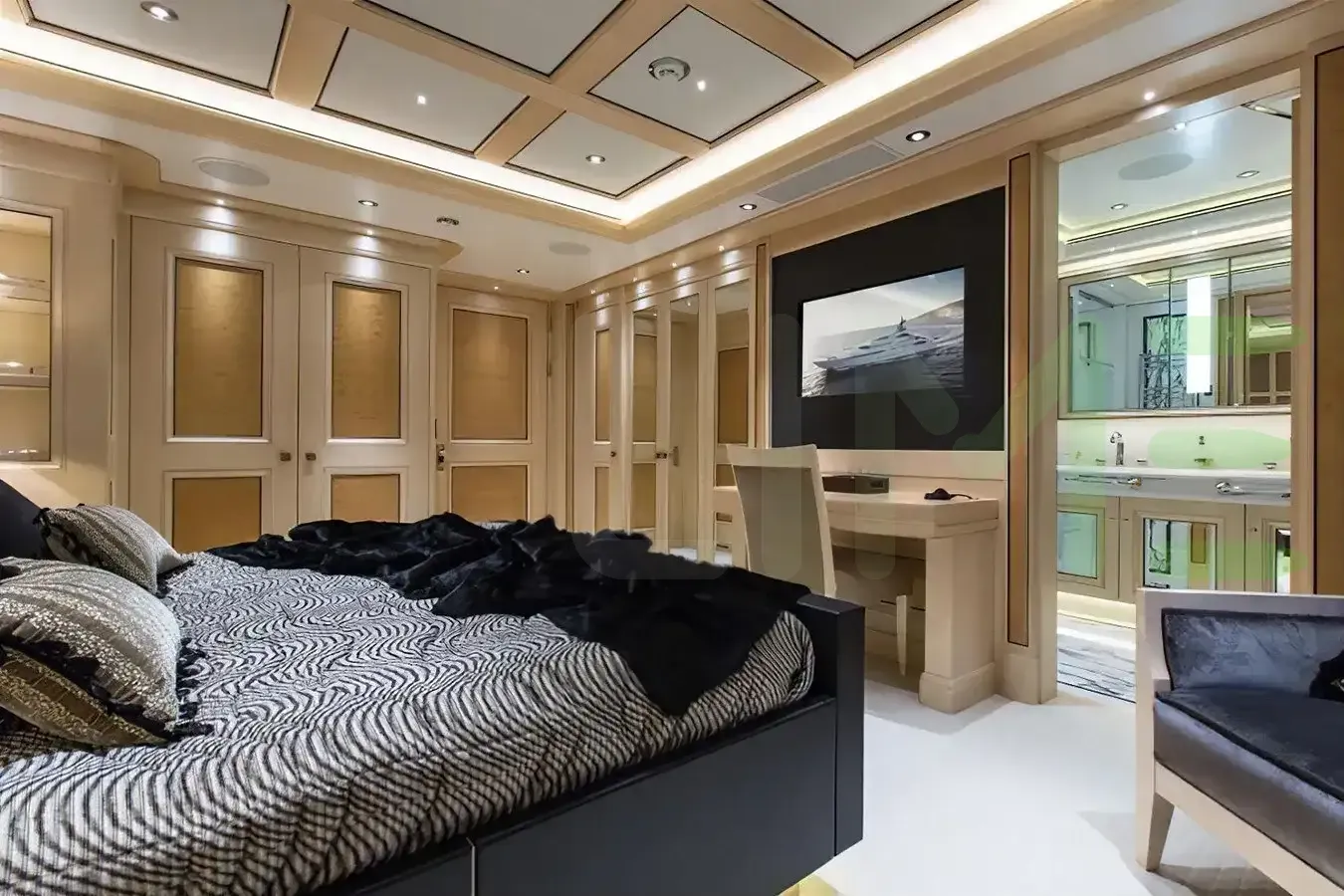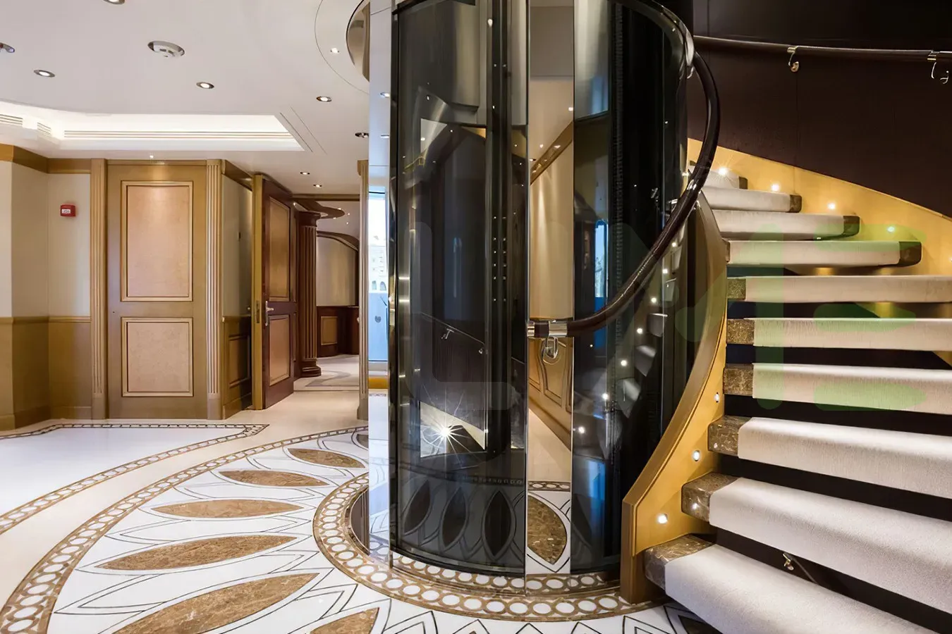 Her features include a dancefloor, beauty salon, elevator, gym and air conditioning.