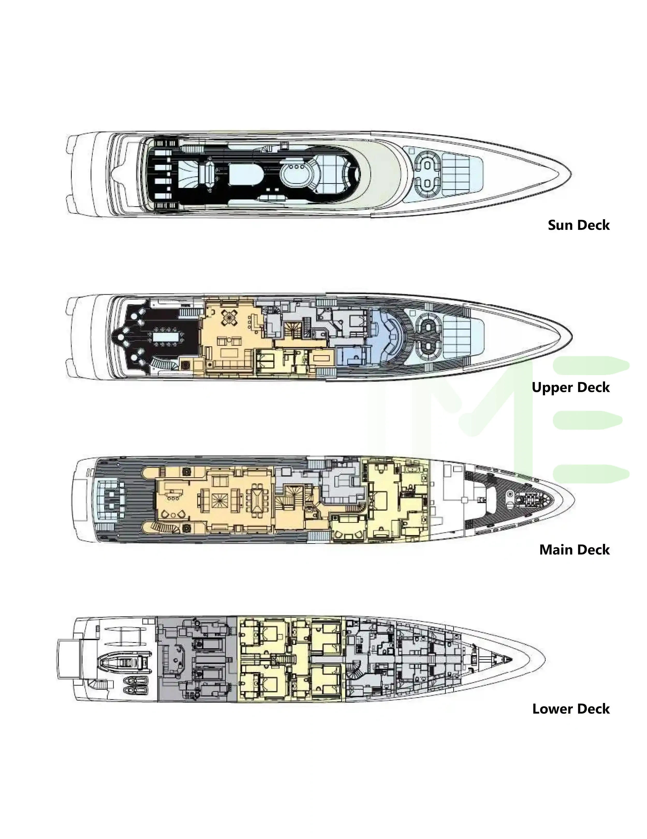 Request plans that include the layout of staterooms, guest areas, and outdoor spaces, as well as crew quarters and work areas.