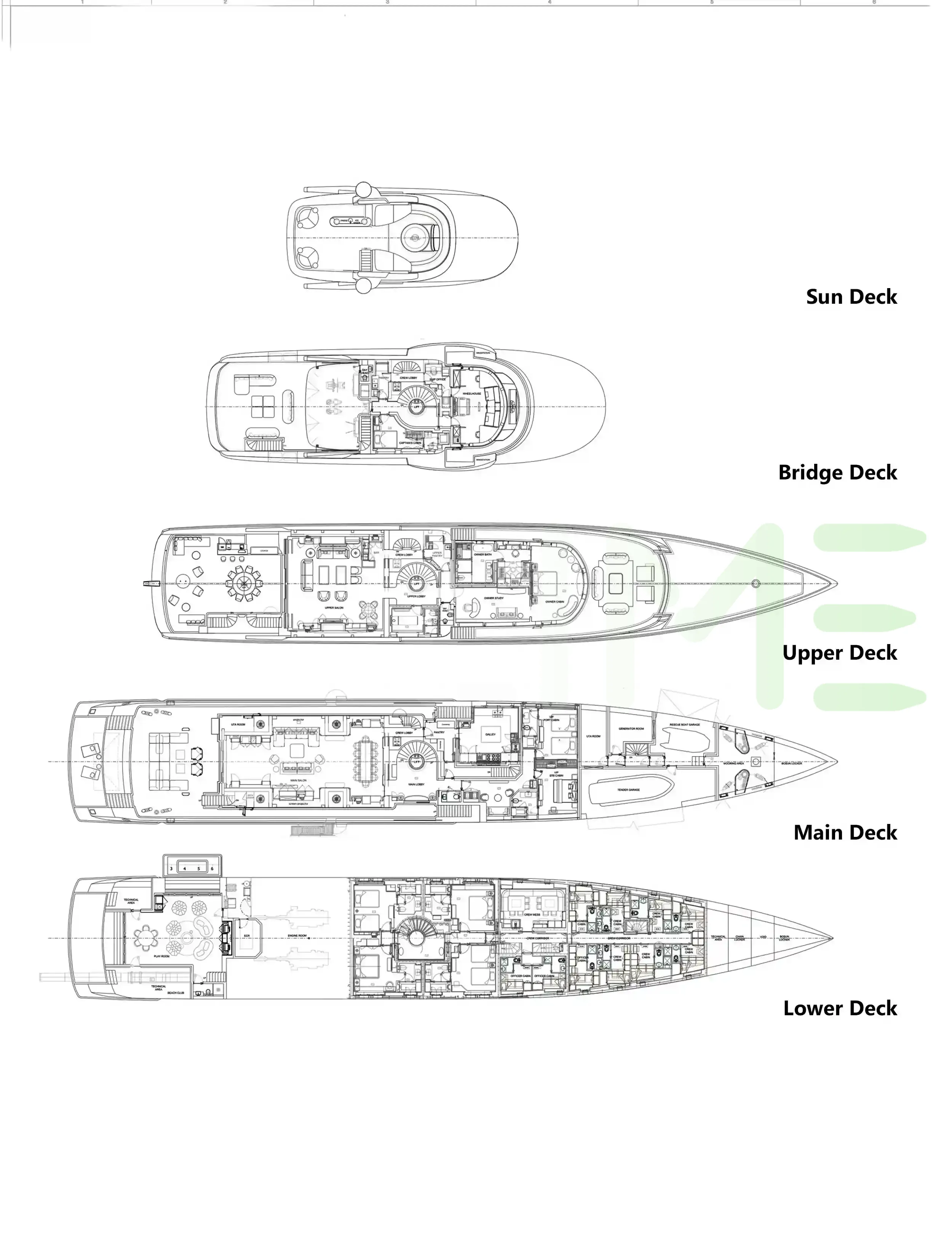 Request plans that include the layout of staterooms, guest areas, and outdoor spaces, as well as crew quarters and work areas.