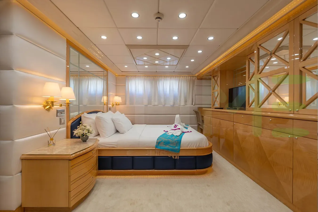 With a gross tonnage of 390, the LADY AZUL yacht for charter provides ample interior space for enjoyment. LADY AZUL offers accommodations for up to 10 guests in 5 lavishly appointed staterooms. She can also carry up to 7 crew onboard, including the Captain, to ensure a relaxed luxury yacht charter experience. The interior design by Paola D. Smith & Associates, Luxury Projects exudes a sense of luxury, seamlessly blending comfort with style.
