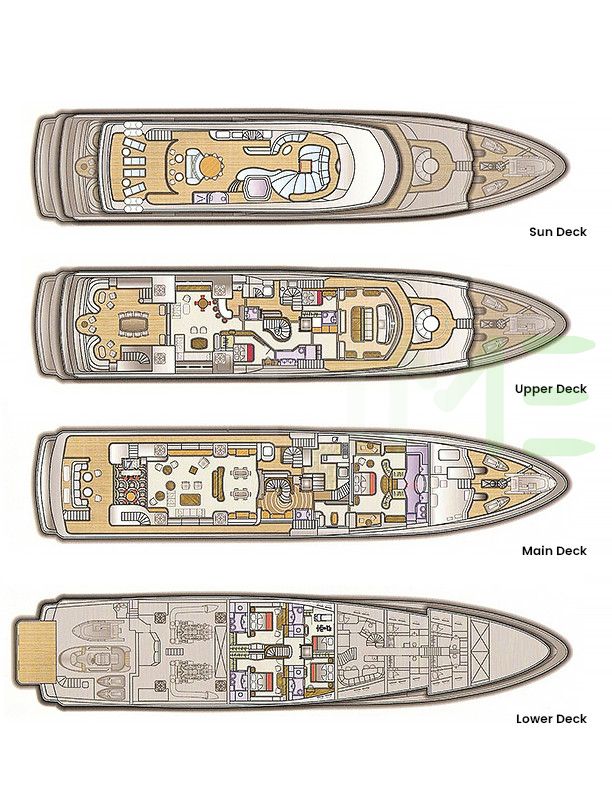 Request plans that include the layout of staterooms, guest areas, and outdoor spaces, as well as crew quarters and work areas.