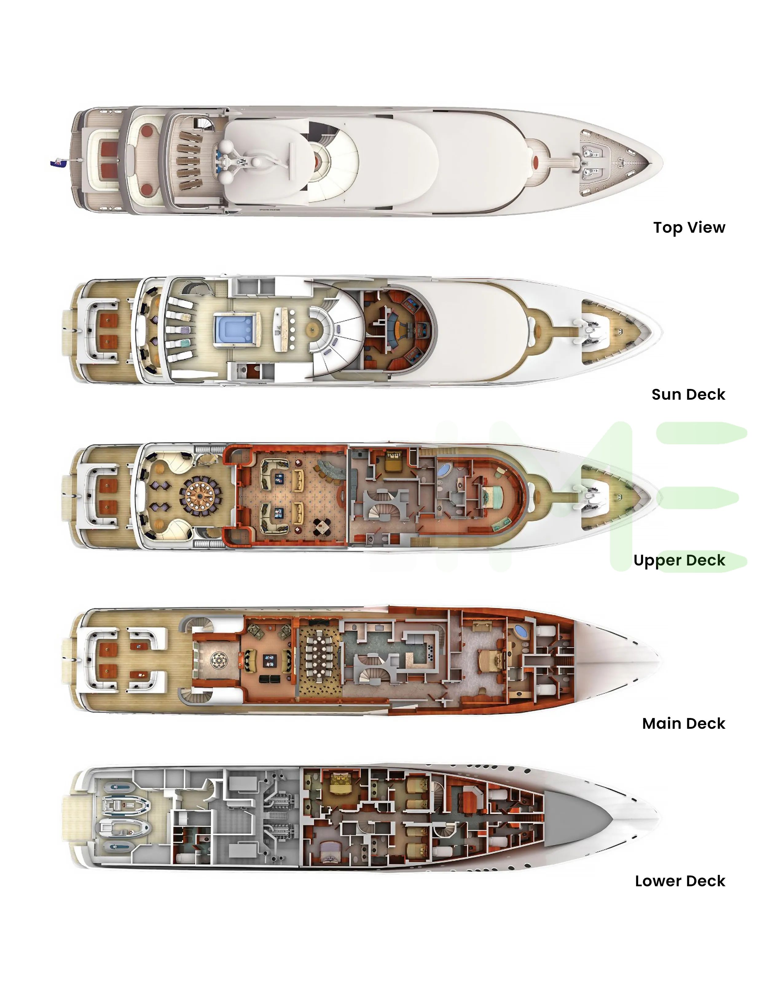 Request plans that include the layout of staterooms, guest areas, and outdoor spaces, as well as crew quarters and work areas.