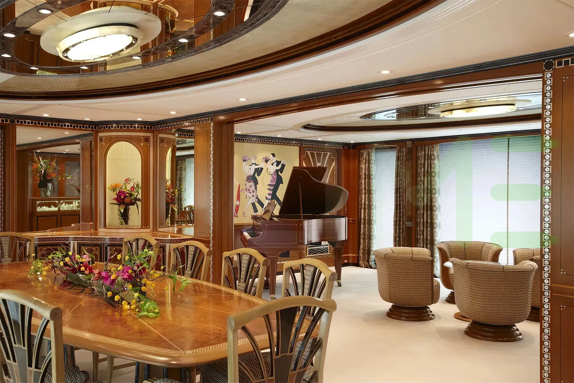 Her features include piano, movie theatre, beauty salon, satellite communications, beach club, gym, deck jacuzzi, WiFi and air conditioning.