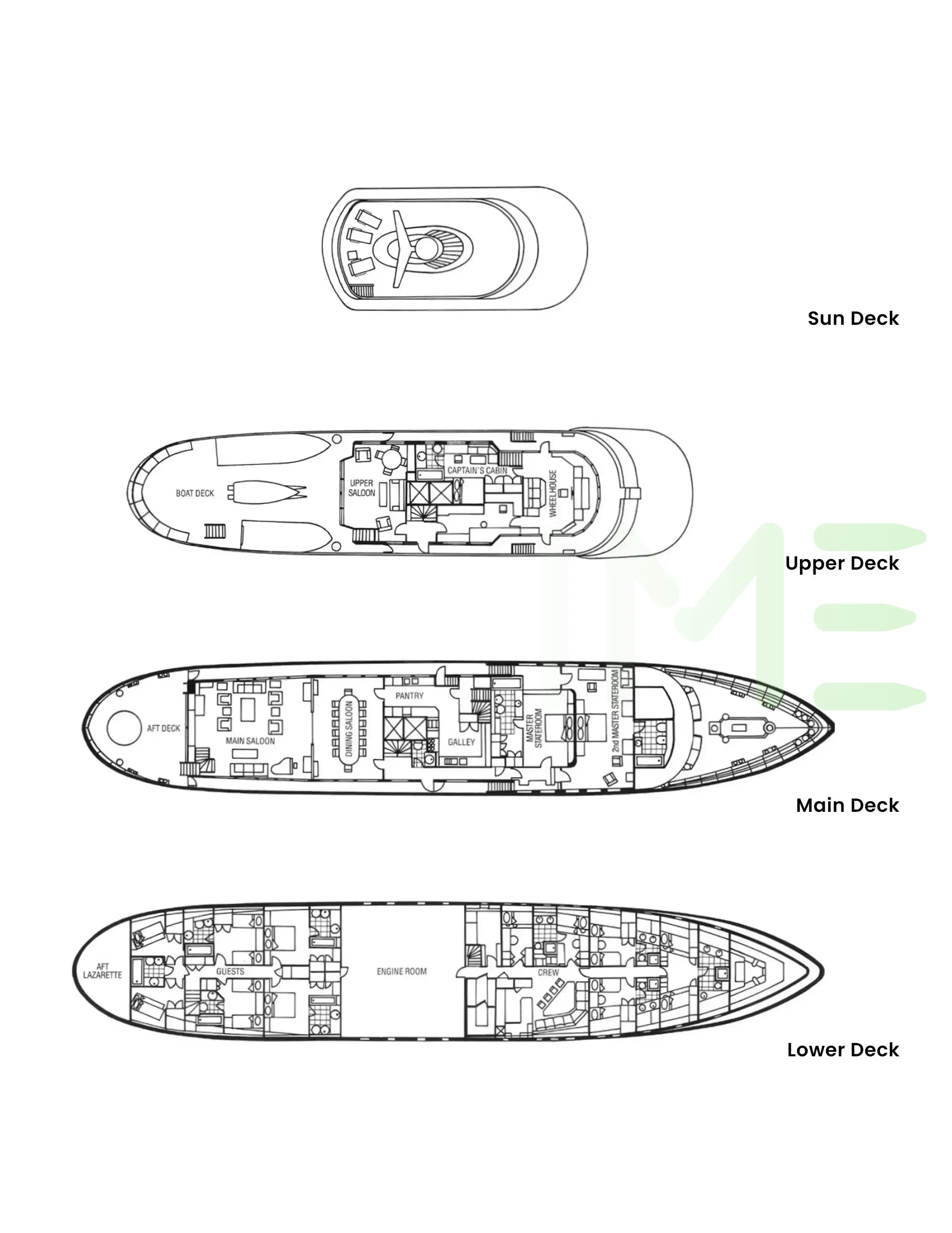 Request plans that include the layout of staterooms, guest areas, and outdoor spaces, as well as crew quarters and work areas.