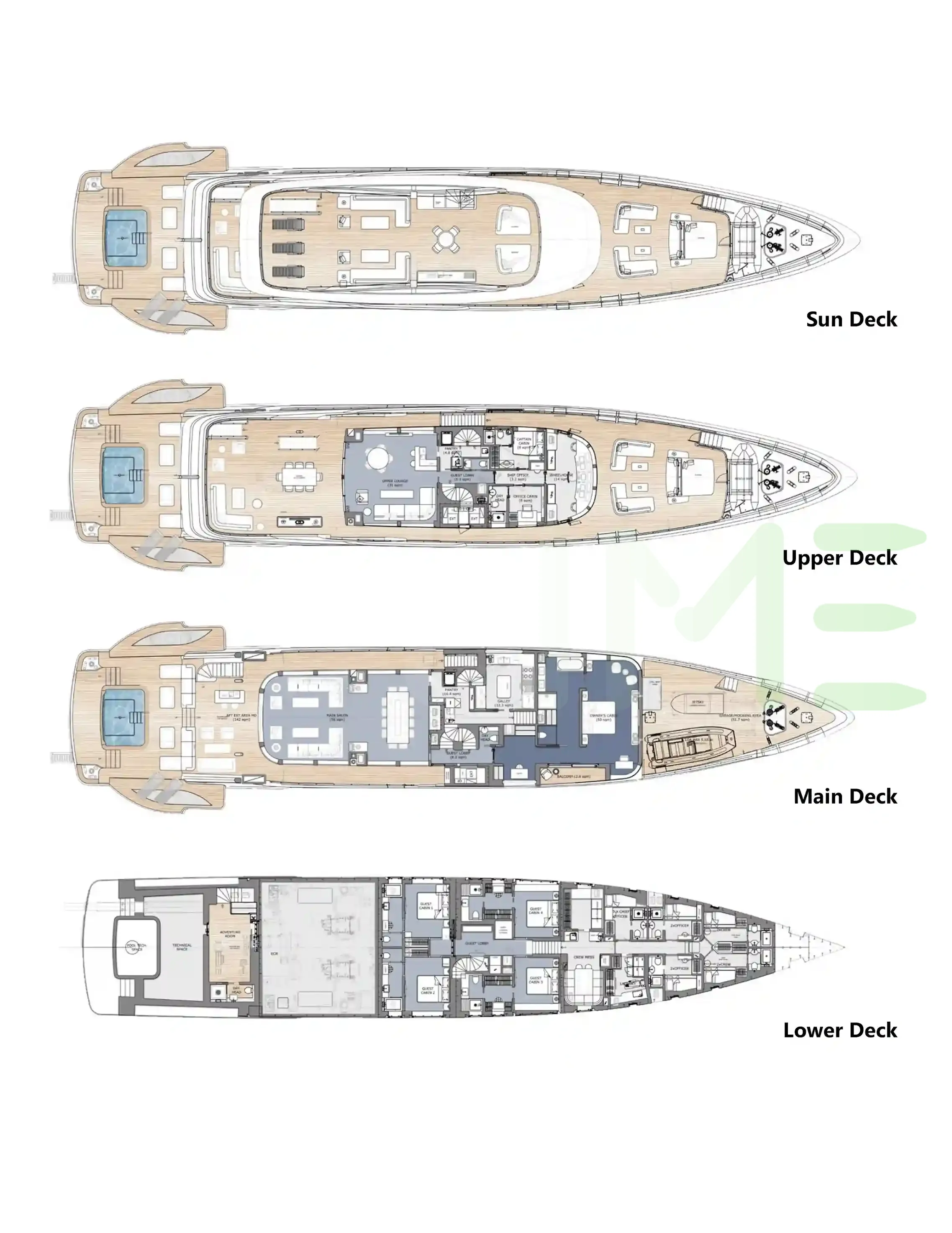 Request plans that include the layout of staterooms, guest areas, and outdoor spaces, as well as crew quarters and work areas.