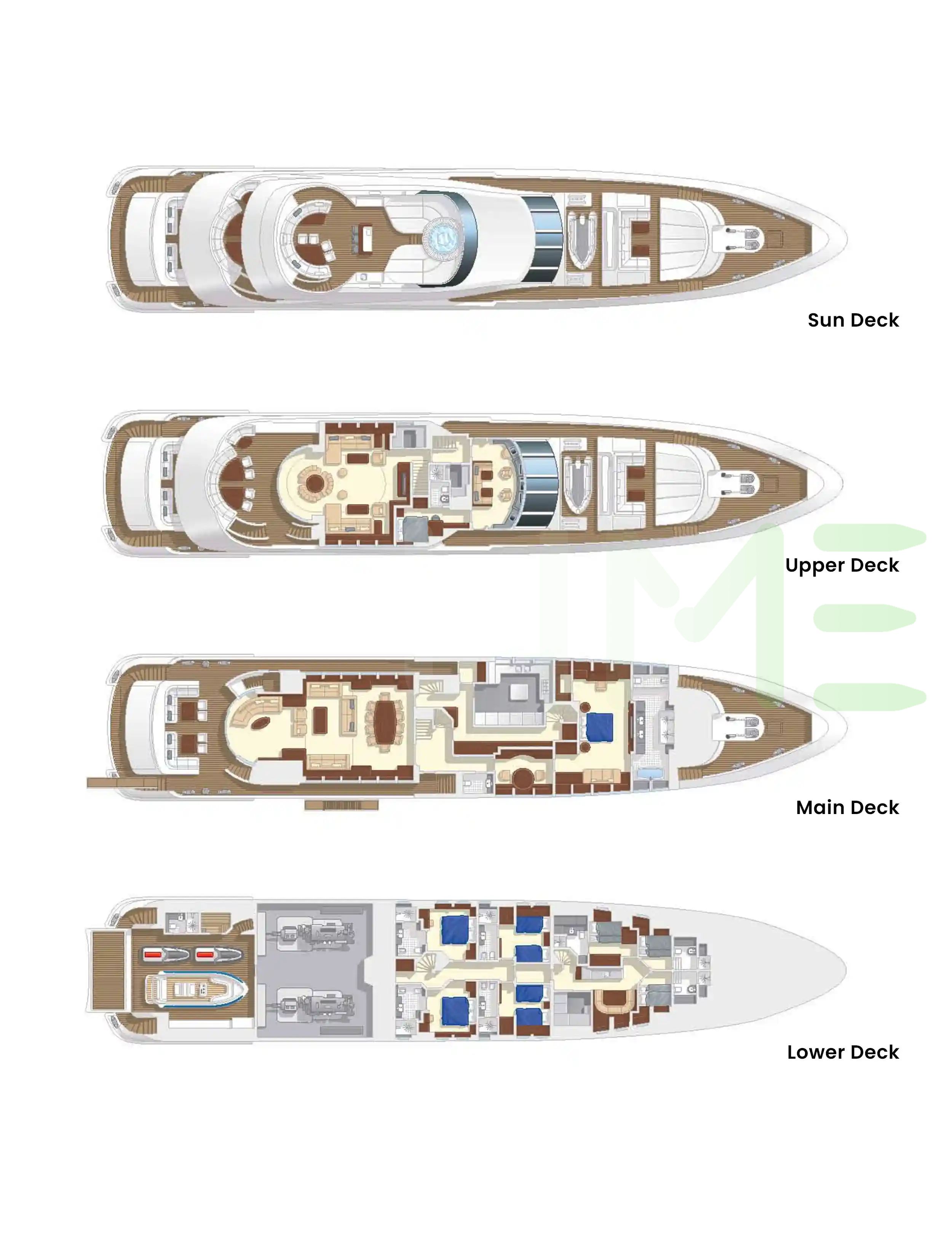 Request plans that include the layout of staterooms, guest areas, and outdoor spaces, as well as crew quarters and work areas.