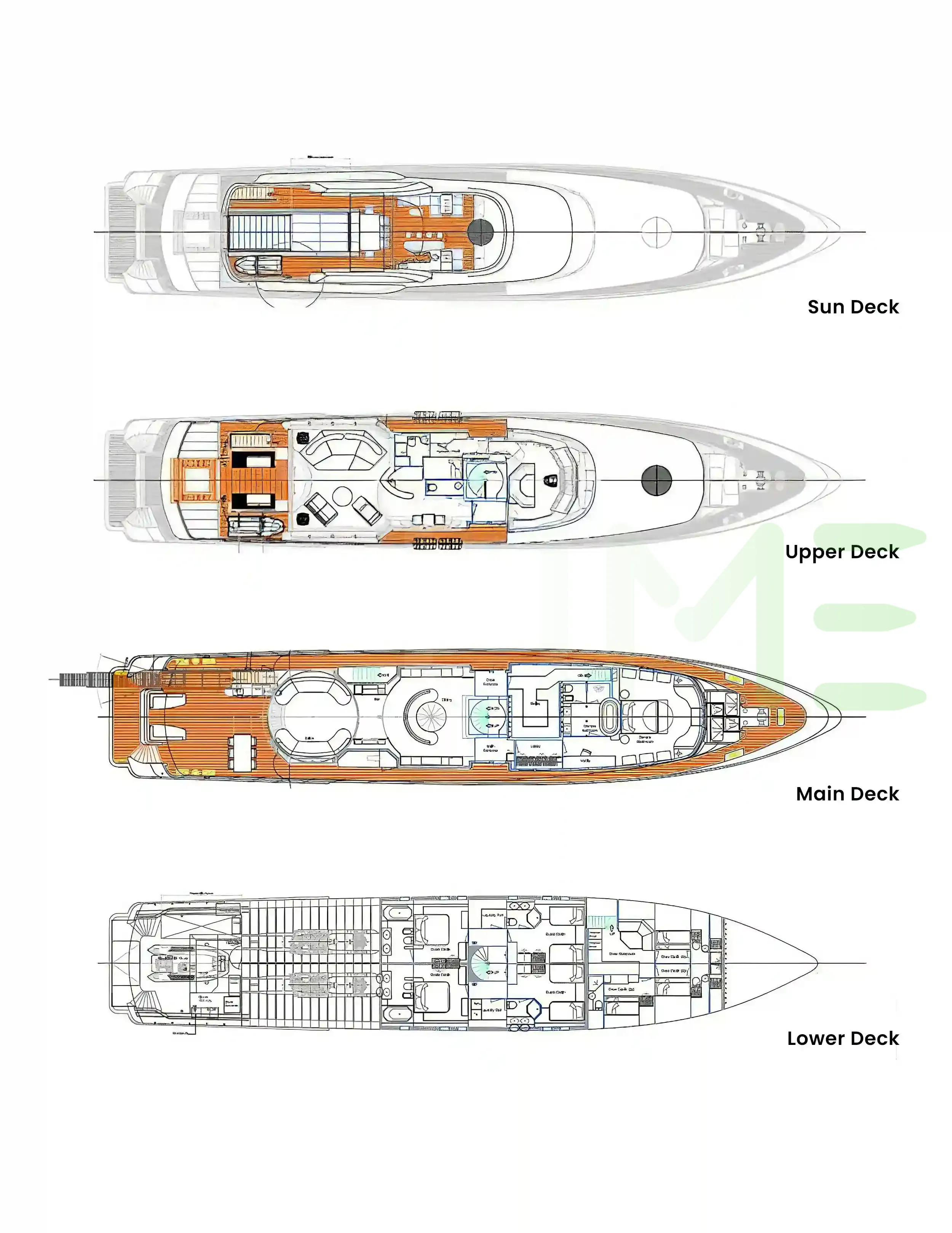 Request plans that include the layout of staterooms, guest areas, and outdoor spaces, as well as crew quarters and work areas.