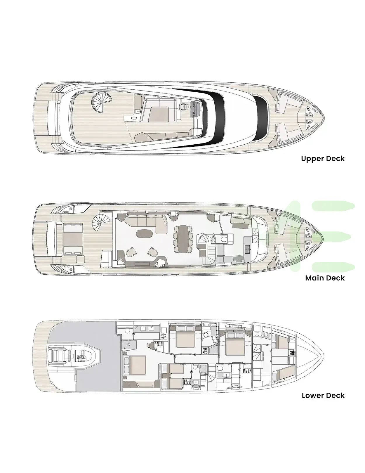 Request plans that include the layout of staterooms, guest areas, and outdoor spaces, as well as crew quarters and work areas.