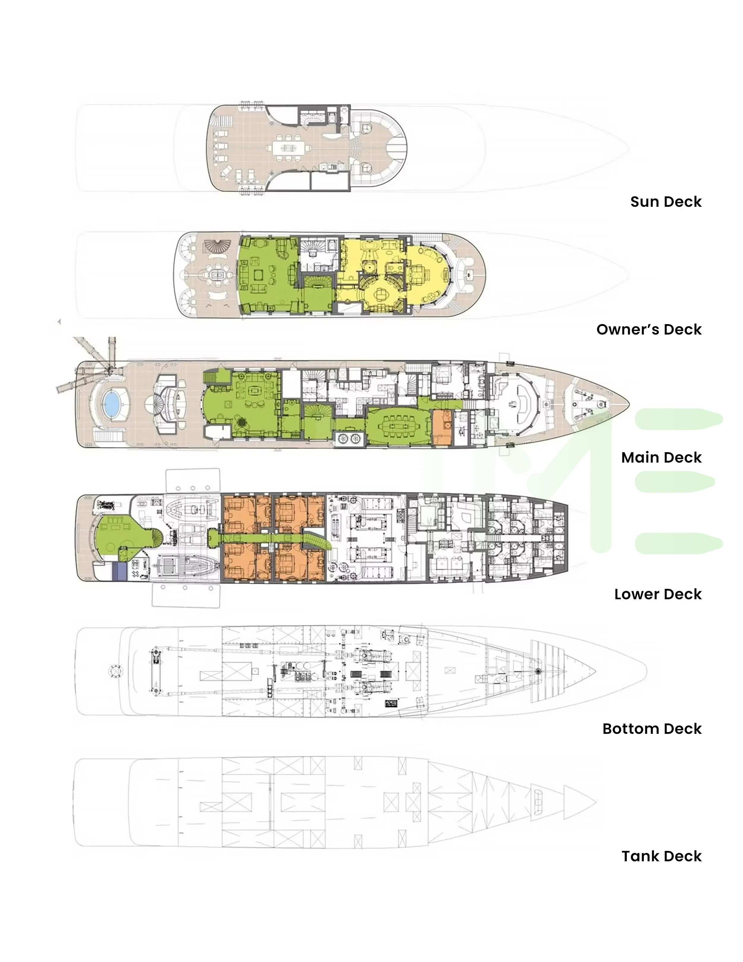 Request plans that include the layout of staterooms, guest areas, and outdoor spaces, as well as crew quarters and work areas.