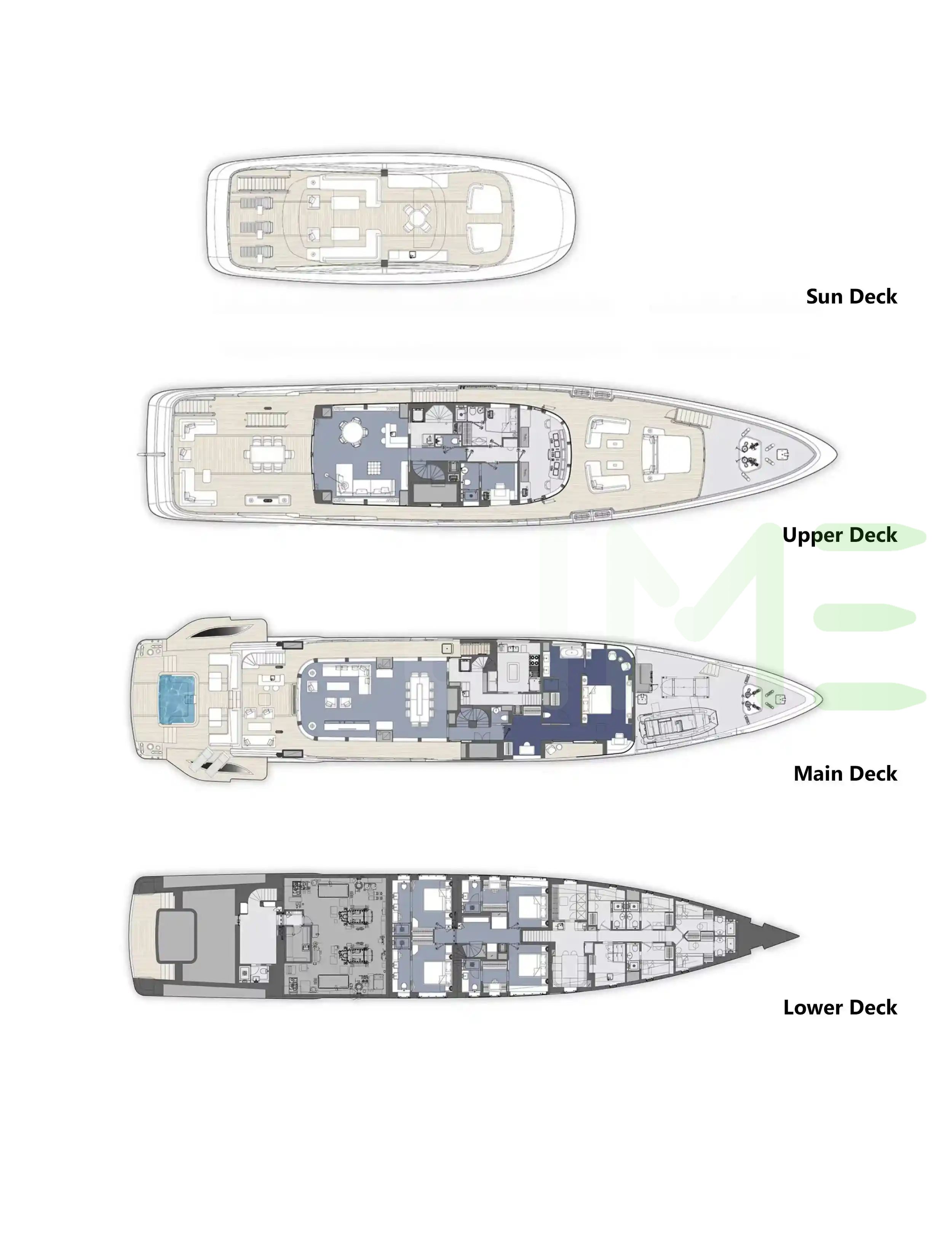 Request plans that include the layout of staterooms, guest areas, and outdoor spaces, as well as crew quarters and work areas.