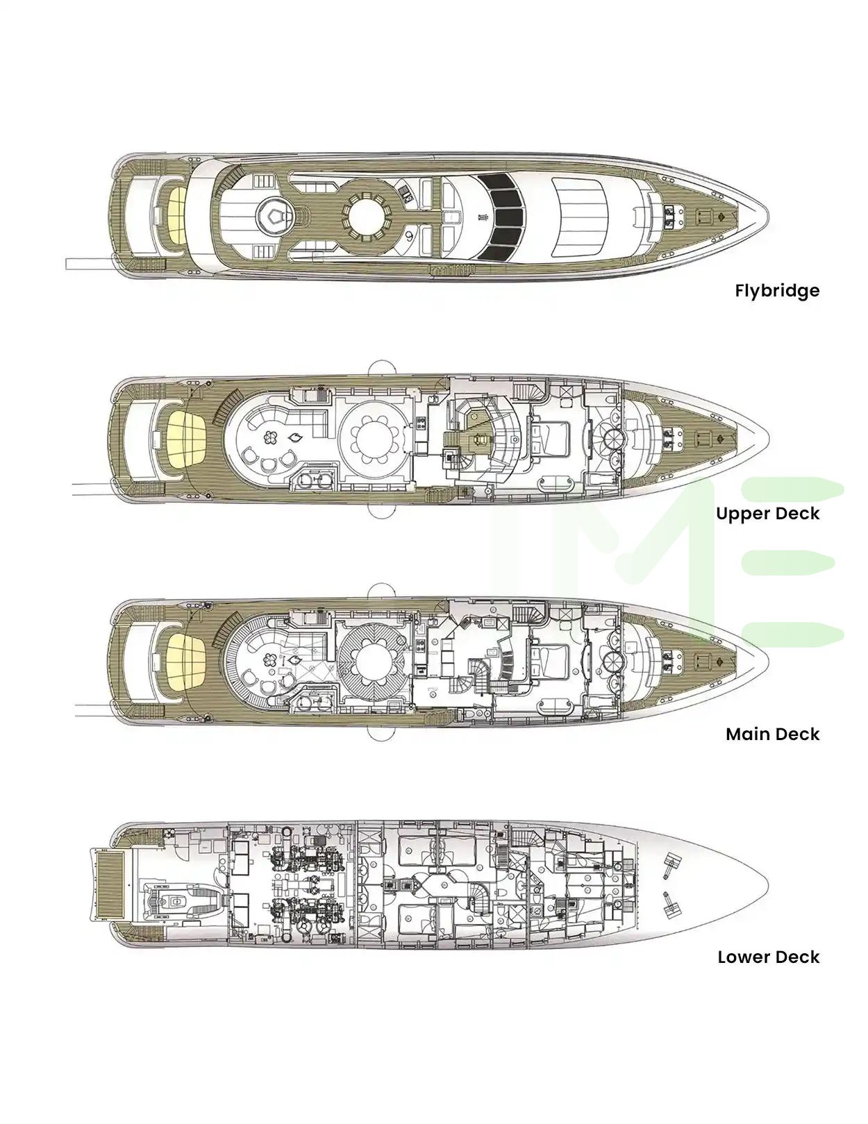 Request plans that include the layout of staterooms, guest areas, and outdoor spaces, as well as crew quarters and work areas.
