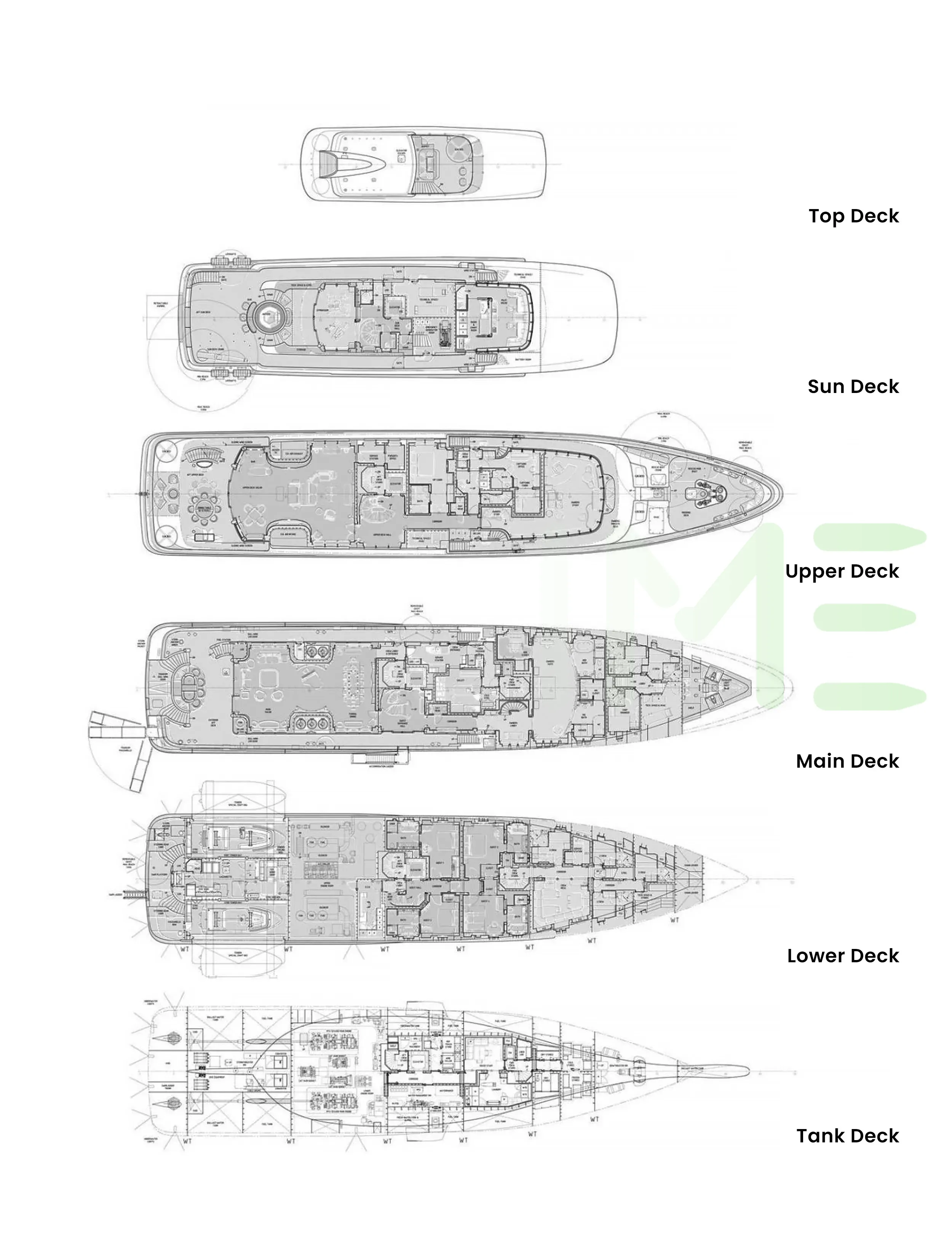 Request plans that include the layout of staterooms, guest areas, and outdoor spaces, as well as crew quarters and work areas.