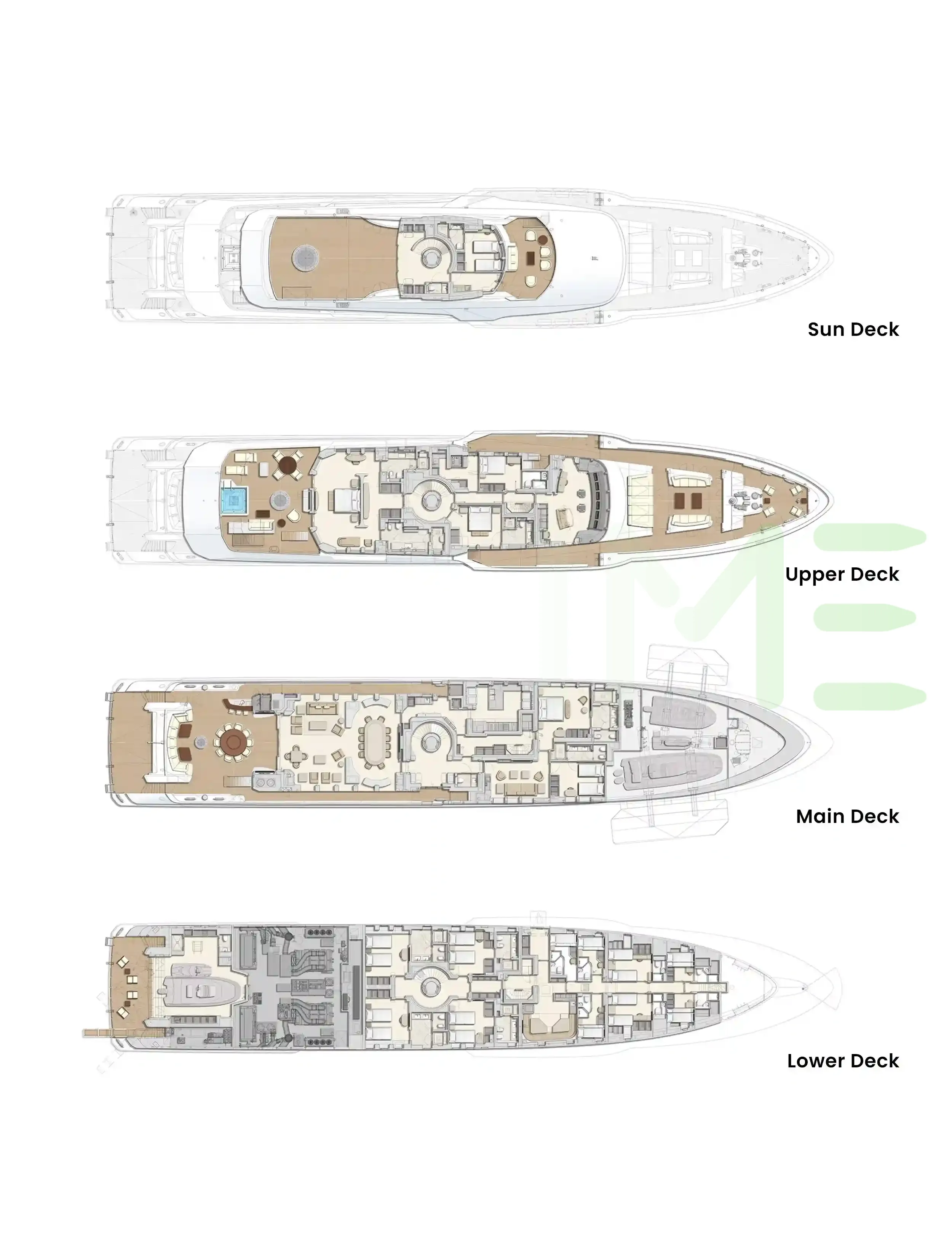 Request plans that include the layout of staterooms, guest areas, and outdoor spaces, as well as crew quarters and work areas.