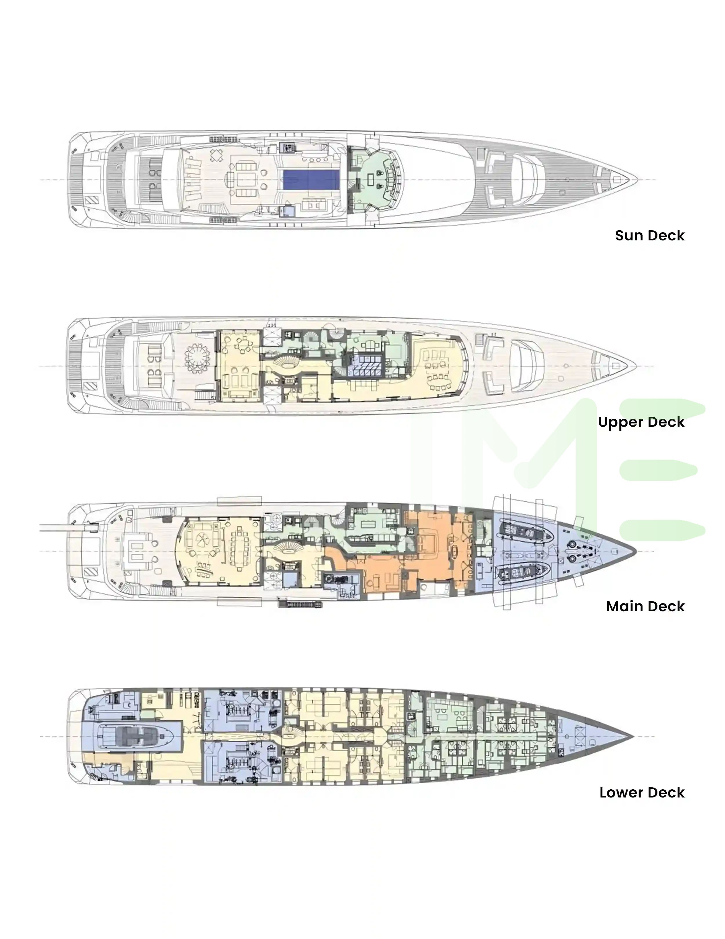 Request plans that include the layout of staterooms, guest areas, and outdoor spaces, as well as crew quarters and work areas.