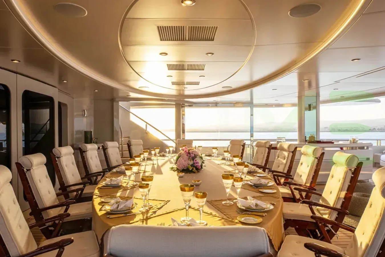 With a gross tonnage of 2,755, the MERIDIAN A yacht for charter provides ample interior space for enjoyment. MERIDIAN A offers accommodations for up to 17 guests in 9 lavishly appointed staterooms. She can also carry up to 27 crew onboard, including the Captain, to ensure a relaxed luxury yacht charter experience. The interior design by Reymond Langton Design Ltd. exudes a sense of luxury, seamlessly blending comfort with style.