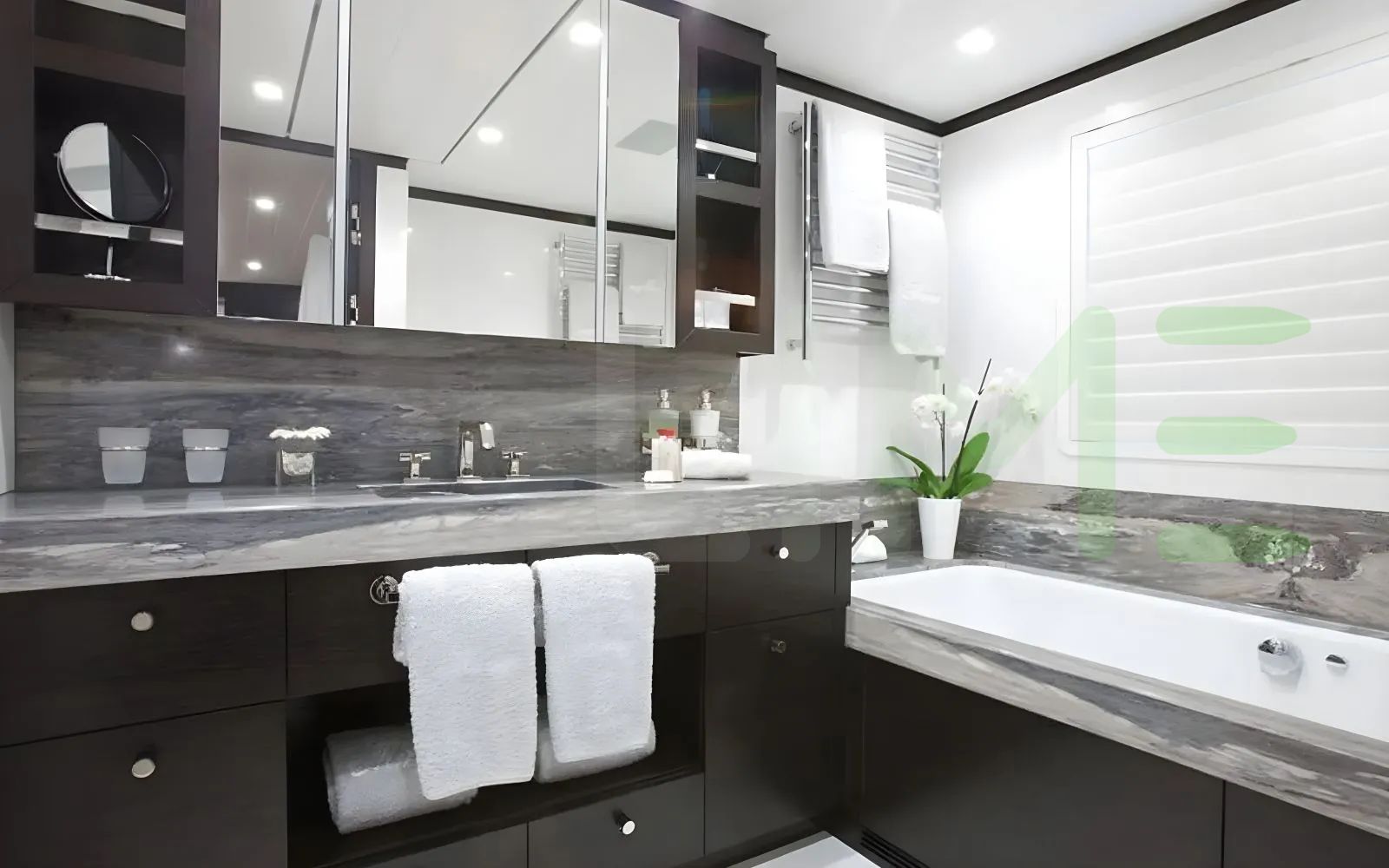 With a gross tonnage of 498, the MIRAGE yacht for charter provides ample interior space for enjoyment. MIRAGE offers accommodations for up to 12 guests in 8 lavishly appointed staterooms. She can also carry up to 13 crew onboard, including the Captain, to ensure a relaxed luxury yacht charter experience. The interior design by Terence Disdale Design, Design Unlimited exudes a sense of luxury, seamlessly blending comfort with style.