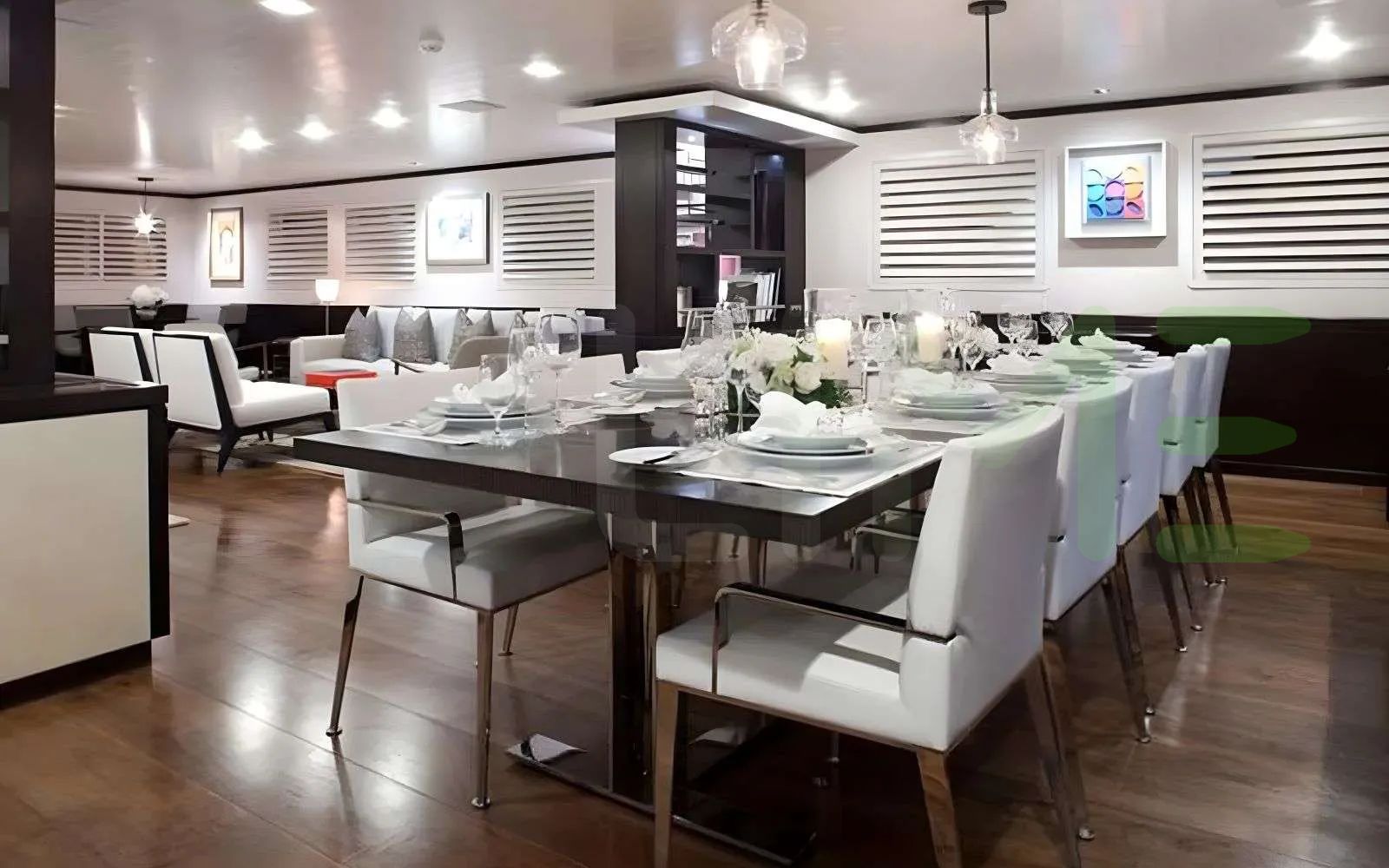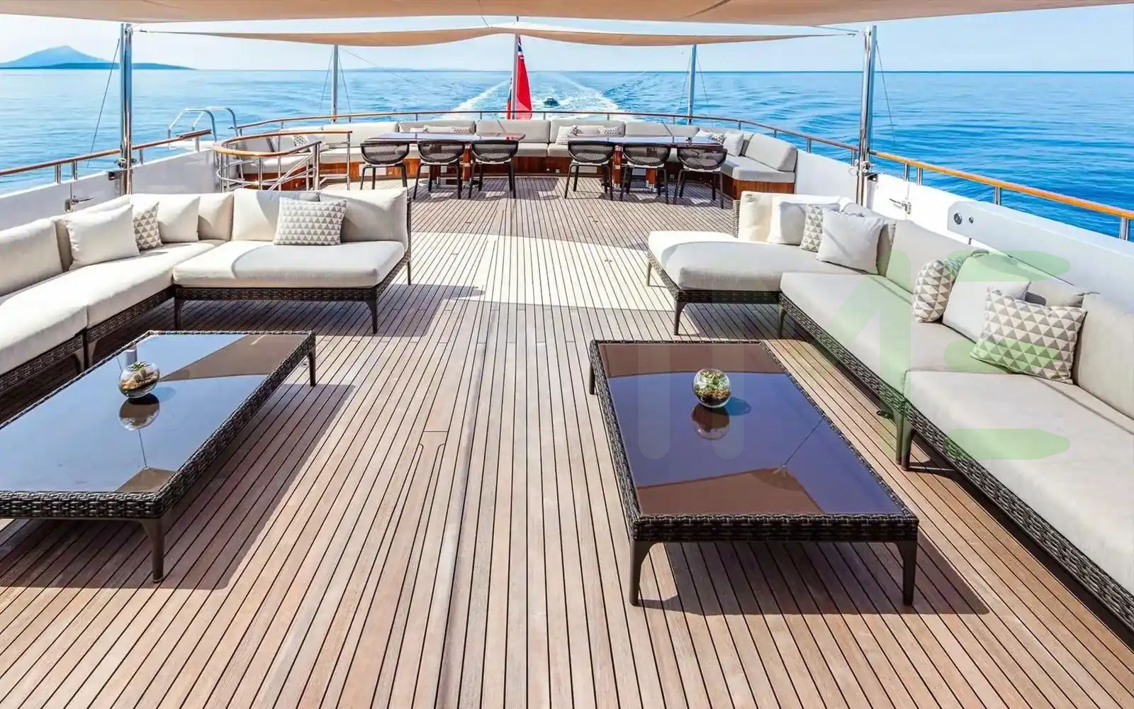The exterior, designed by De Voogt Naval Architects, captures your attention with beautiful lines and impeccable craftsmanship. Whether you're lounging on the spacious decks or enjoying water sports in a secluded anchorage, the MIRAGE yacht for charter, built of Steel and Aluminium, offers a wealth of opportunities for relaxation and adventure.