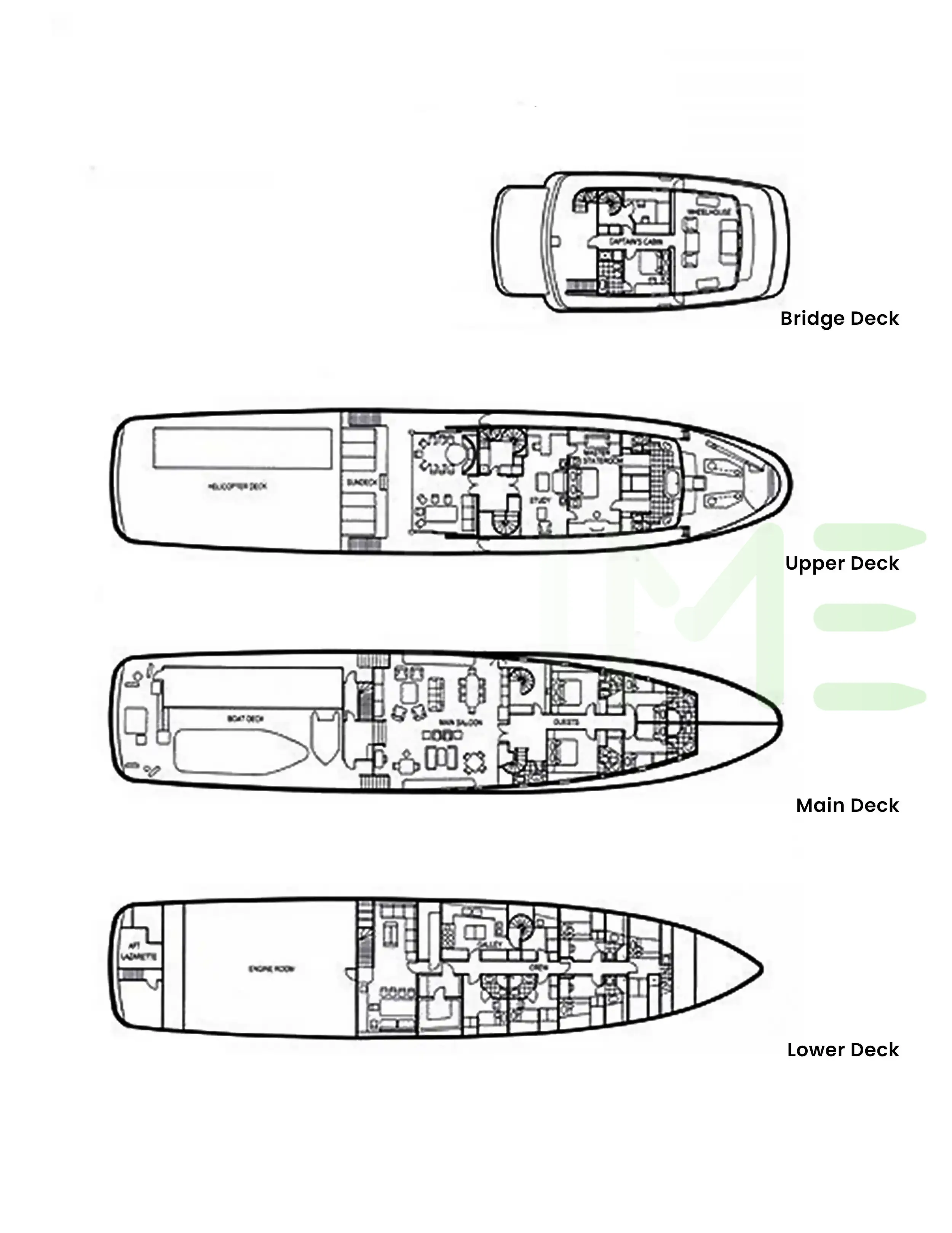 Request plans that include the layout of staterooms, guest areas, and outdoor spaces, as well as crew quarters and work areas.