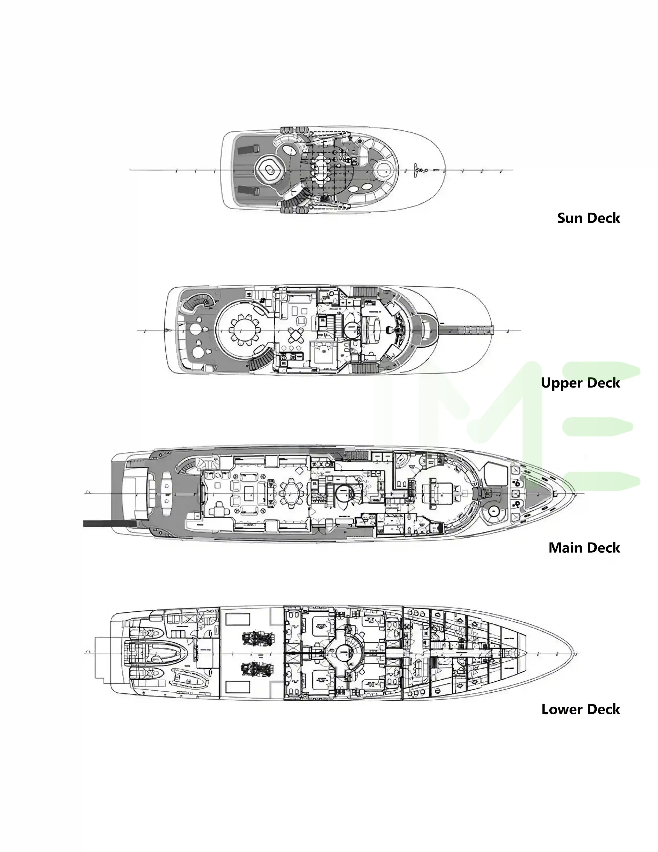 Request plans that include the layout of staterooms, guest areas, and outdoor spaces, as well as crew quarters and work areas.