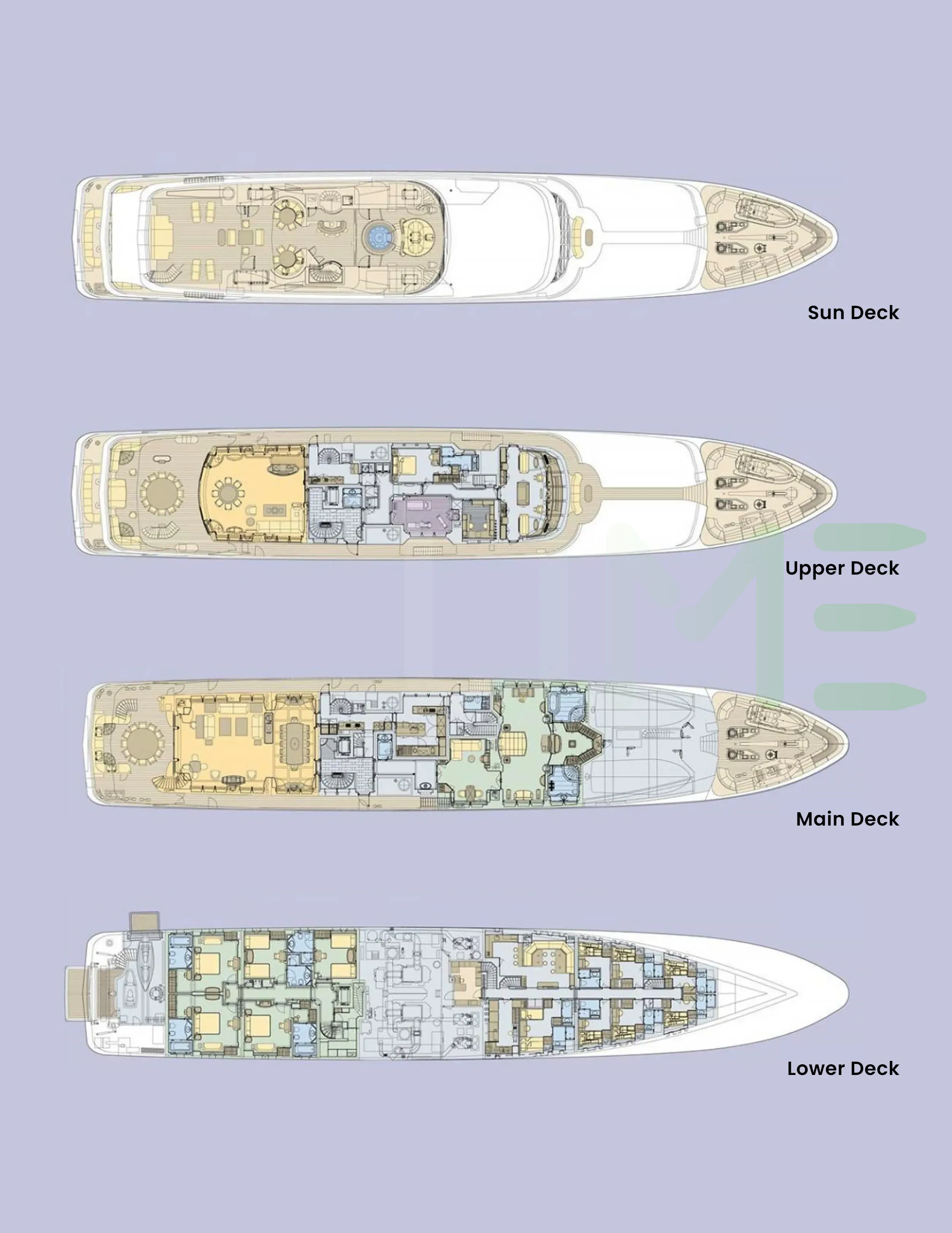 Request plans that include the layout of staterooms, guest areas, and outdoor spaces, as well as crew quarters and work areas.