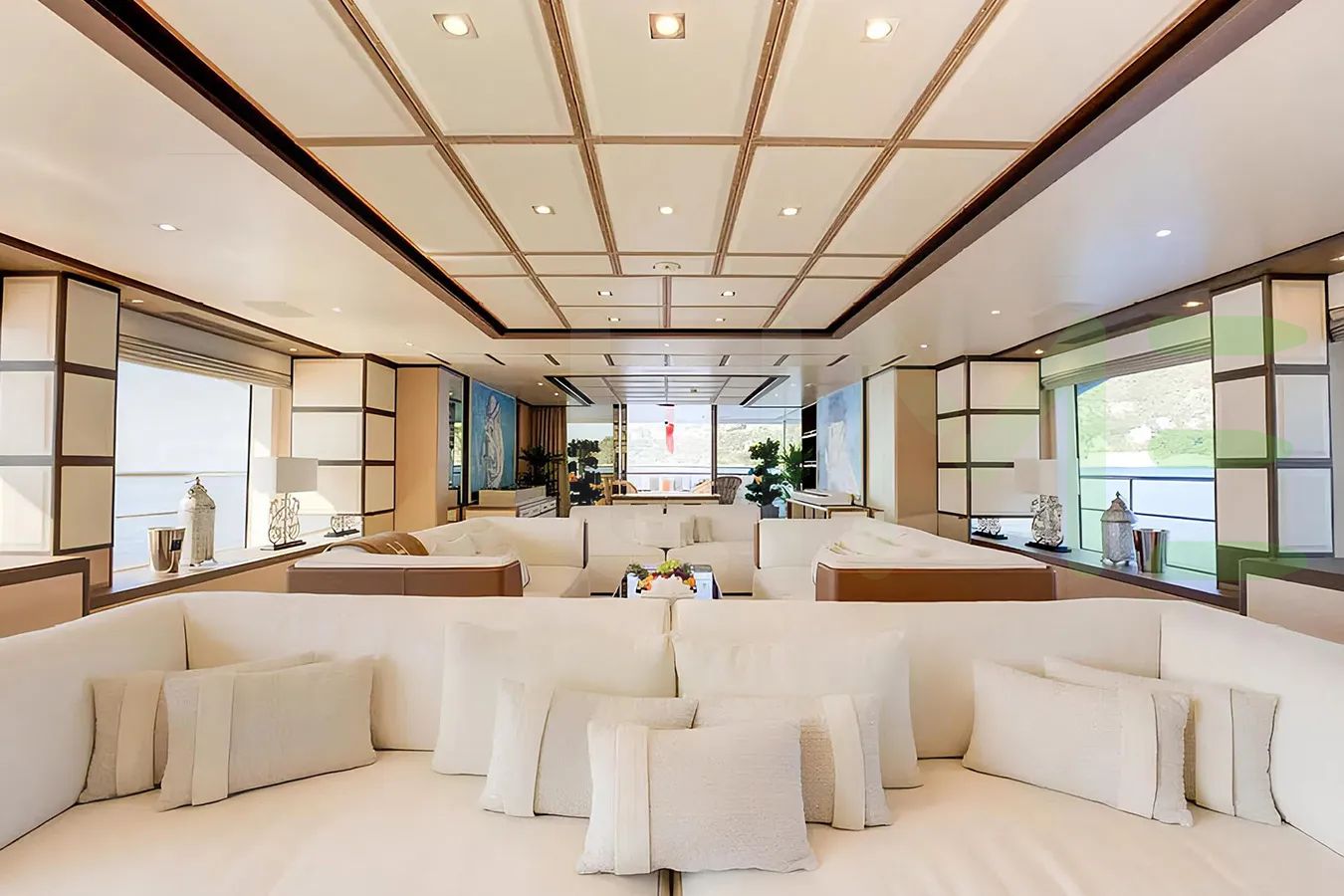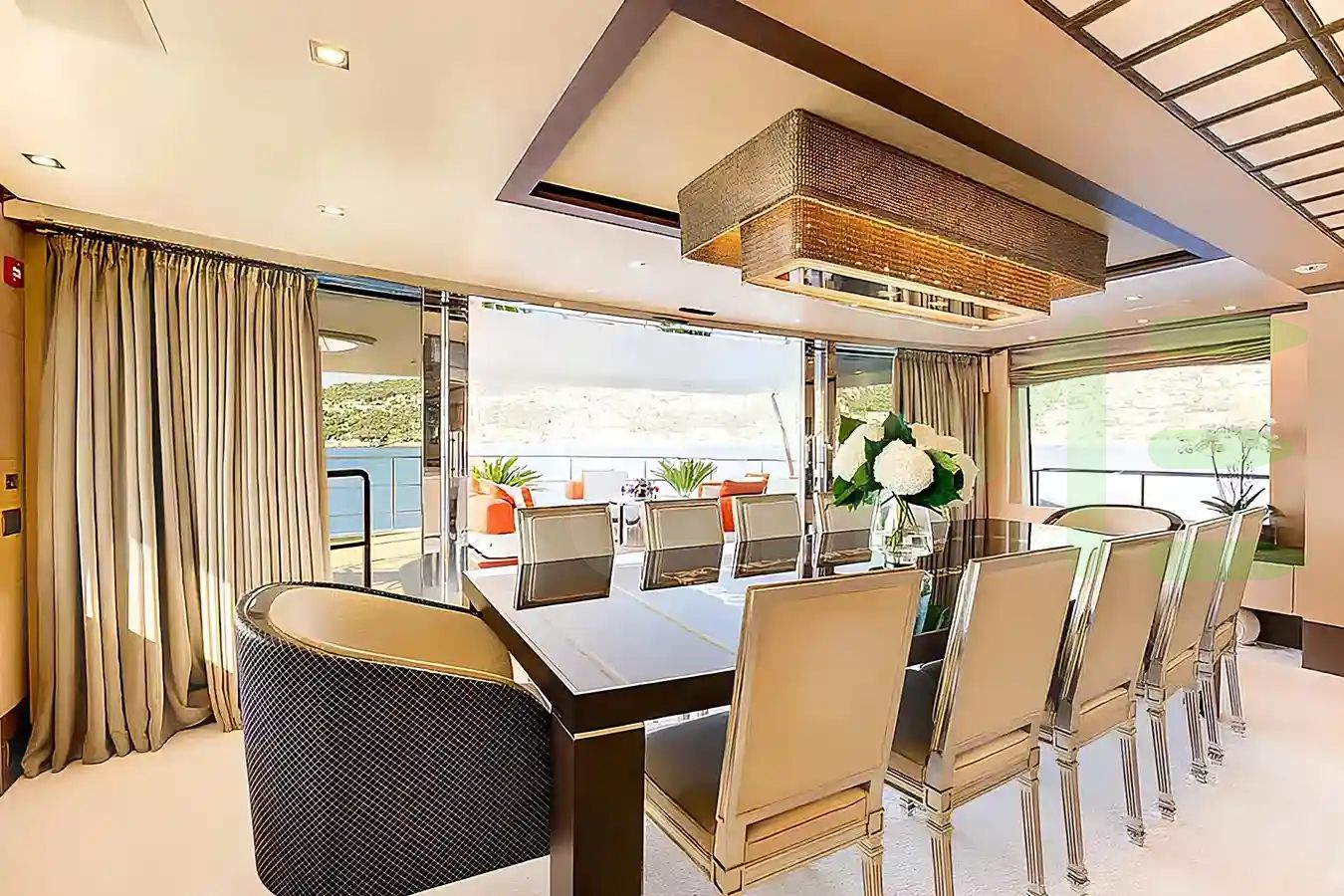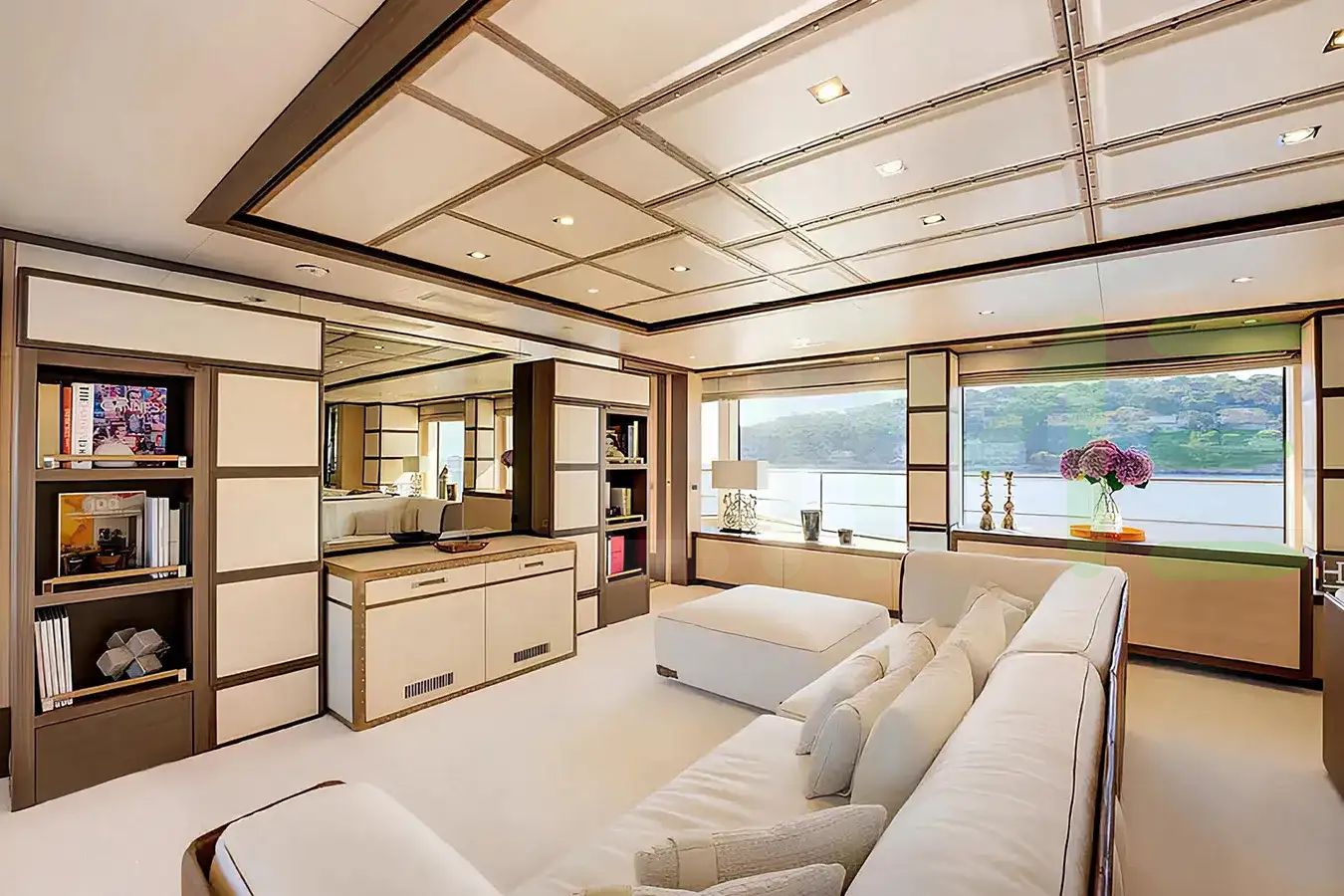 With a gross tonnage of 464, the NELA yacht for charter provides ample interior space for enjoyment. NELA offers accommodations for up to 10 guests in 5 lavishly appointed staterooms. She can also carry up to 9 crew onboard, including the Captain, to ensure a relaxed luxury yacht charter experience. The interior design by Zuretti Interior Design exudes a sense of luxury, seamlessly blending comfort with style.