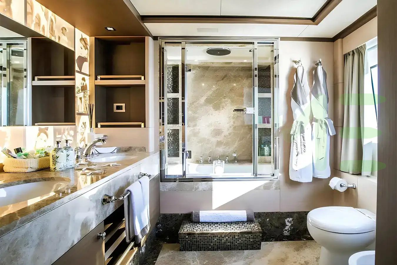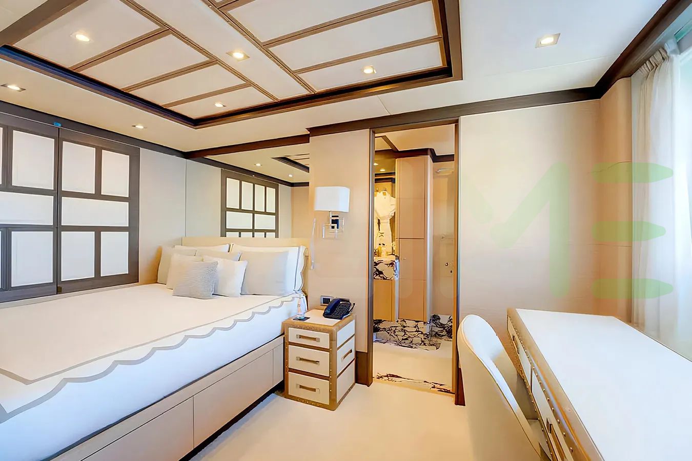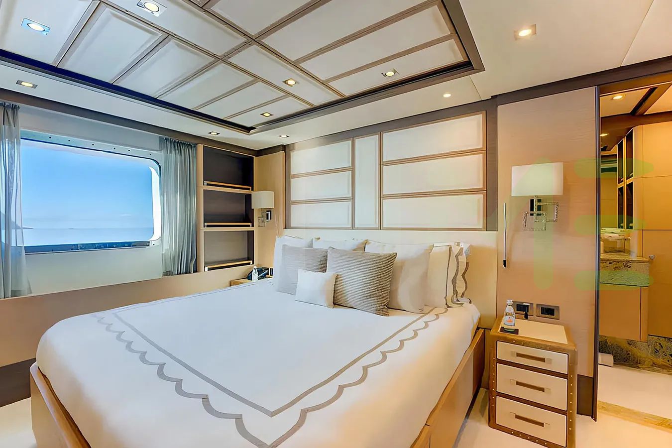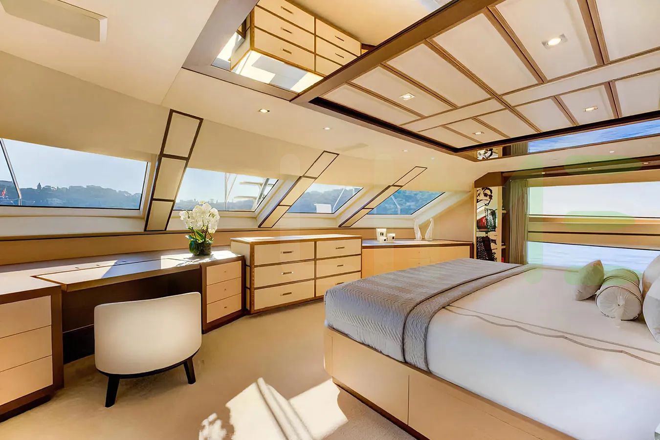 With a gross tonnage of 464, the NELA yacht for charter provides ample interior space for enjoyment. NELA offers accommodations for up to 10 guests in 5 lavishly appointed staterooms. She can also carry up to 9 crew onboard, including the Captain, to ensure a relaxed luxury yacht charter experience. The interior design by Zuretti Interior Design exudes a sense of luxury, seamlessly blending comfort with style.