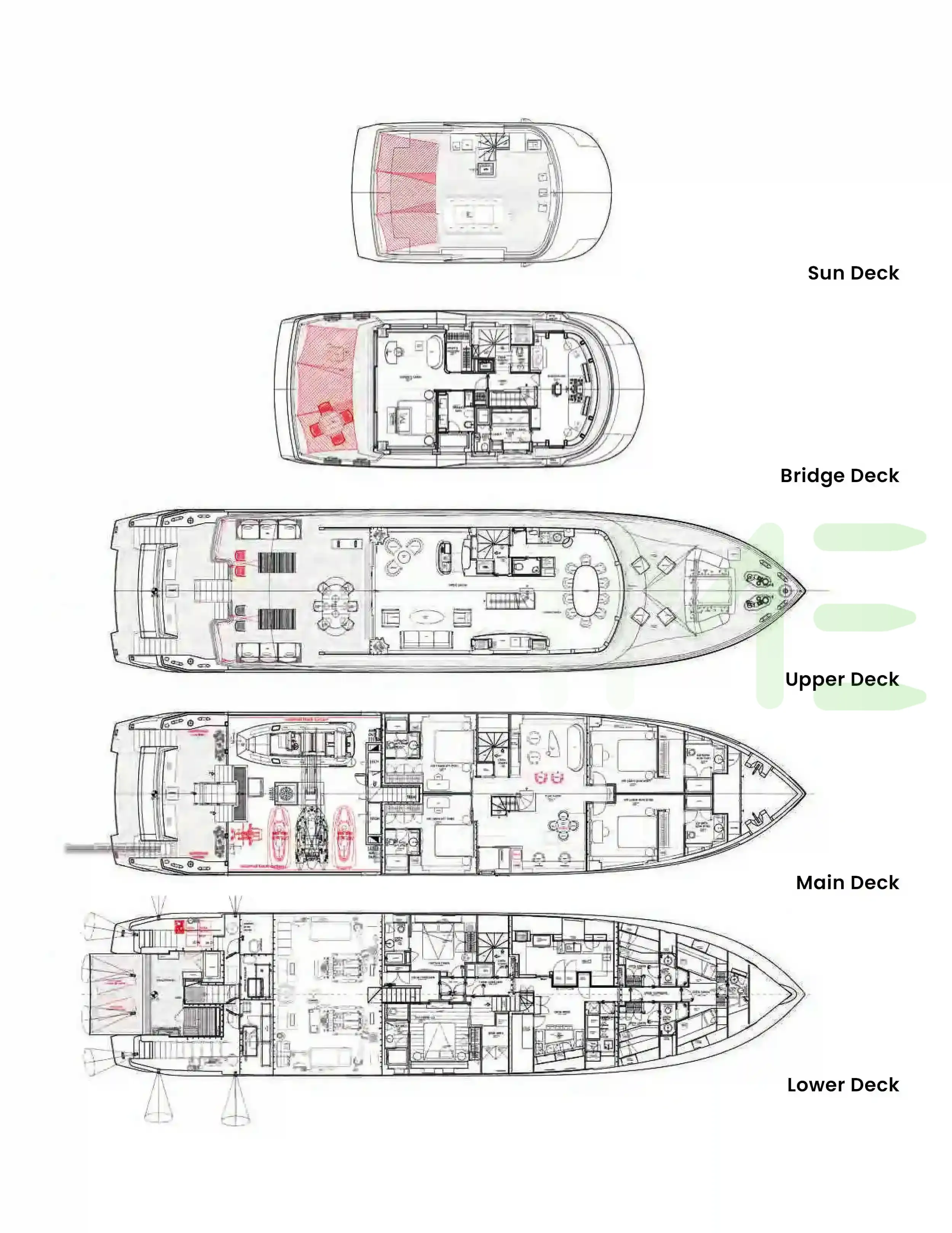Request plans that include the layout of staterooms, guest areas, and outdoor spaces, as well as crew quarters and work areas.