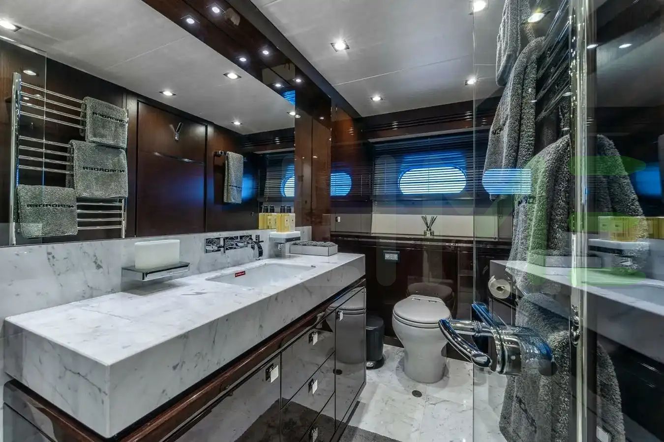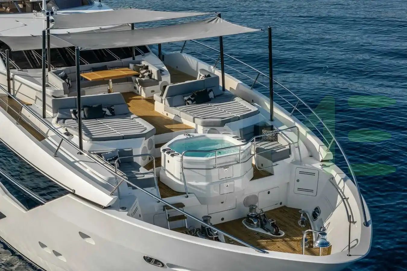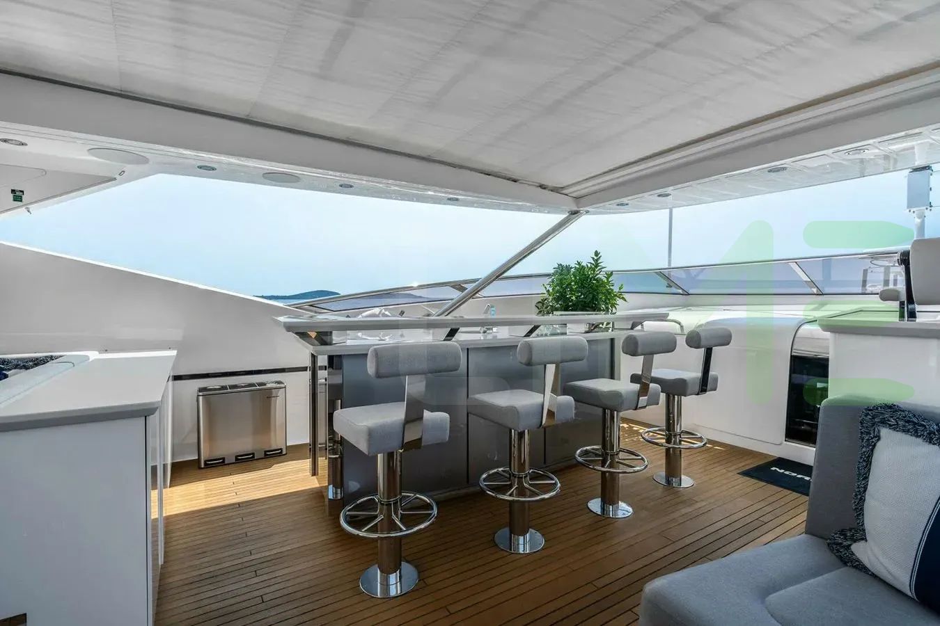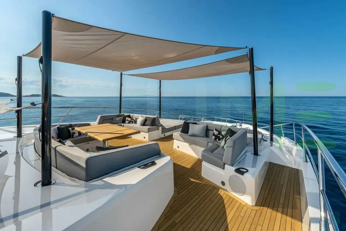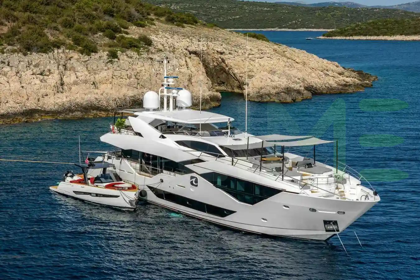 The exterior, designed by Sunseeker, captures your attention with beautiful lines and impeccable craftsmanship. Whether you're lounging on the spacious decks or enjoying water sports in a secluded anchorage, the NOROADER yacht for charter, built of GRP, offers a wealth of opportunities for relaxation and adventure.