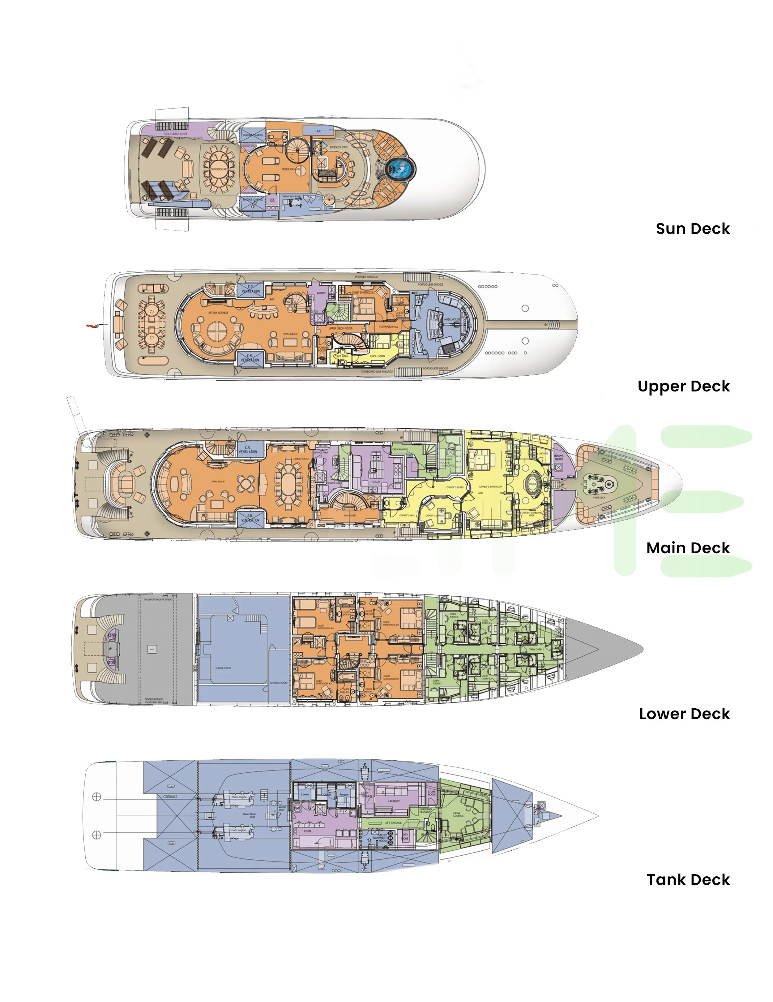 Request plans that include the layout of staterooms, guest areas, and outdoor spaces, as well as crew quarters and work areas.