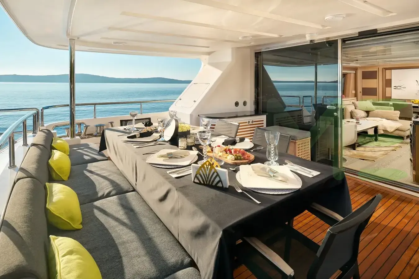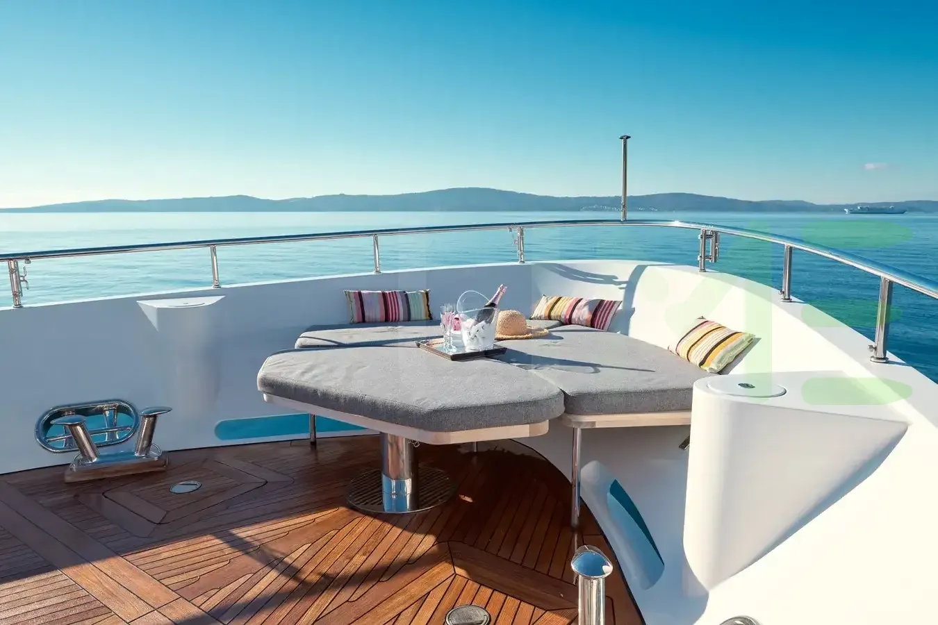 The exterior, designed by Stefano Righini Design, captures your attention with beautiful lines and impeccable craftsmanship. Whether you're lounging on the spacious decks or enjoying water sports in a secluded anchorage, the OCEAN DRIVE yacht for charter, built of GRP, offers a wealth of opportunities for relaxation and adventure.