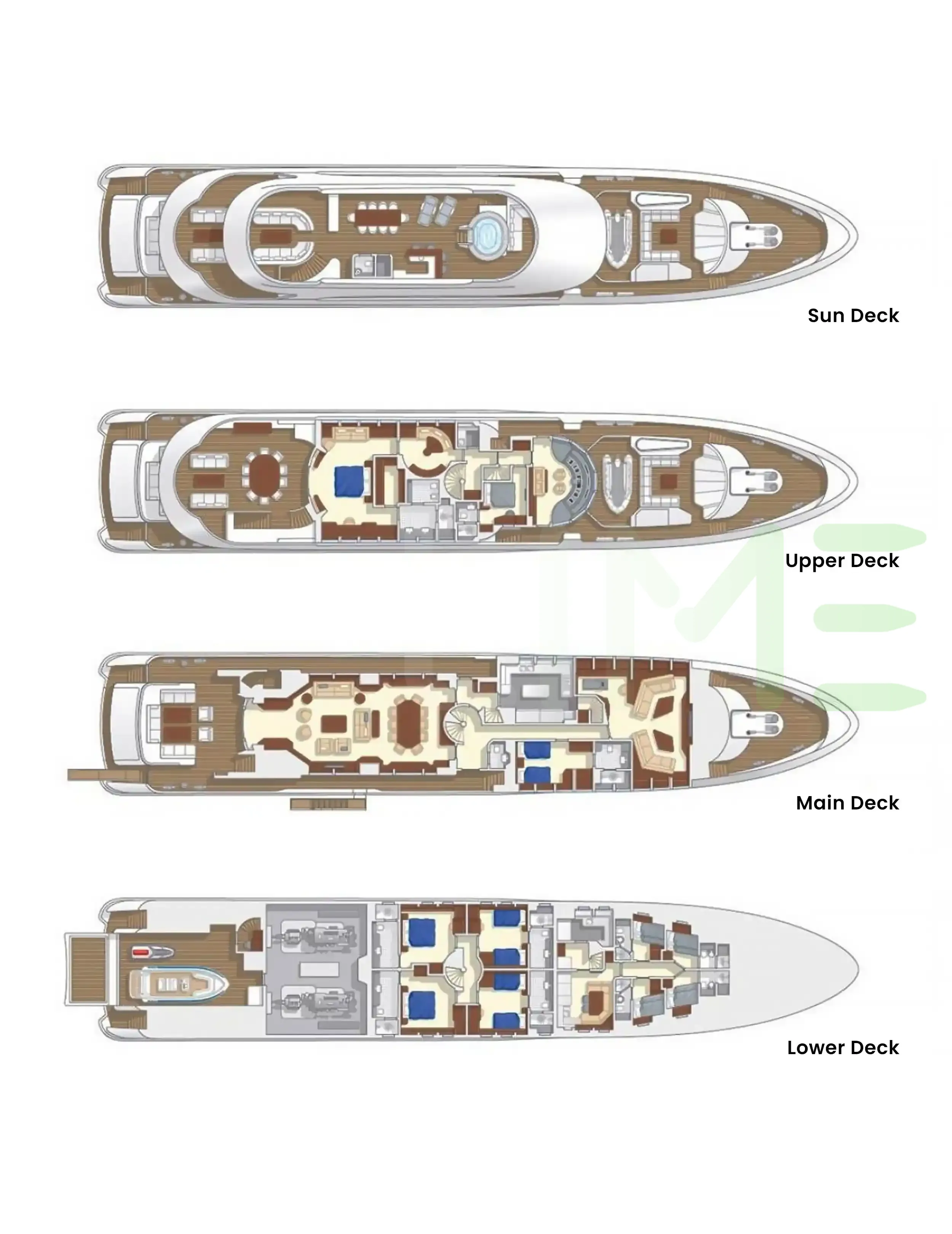 Request plans that include the layout of staterooms, guest areas, and outdoor spaces, as well as crew quarters and work areas.