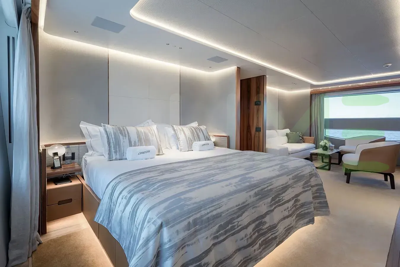 With a gross tonnage of 392, the OREOS yacht for charter provides ample interior space for enjoyment. OREOS offers accommodations for up to 10 guests in 5 lavishly appointed staterooms. She can also carry up to 9 crew onboard, including the Captain, to ensure a relaxed luxury yacht charter experience. The interior design by Bonetti / Kozerski architecture DPC exudes a sense of luxury, seamlessly blending comfort with style.