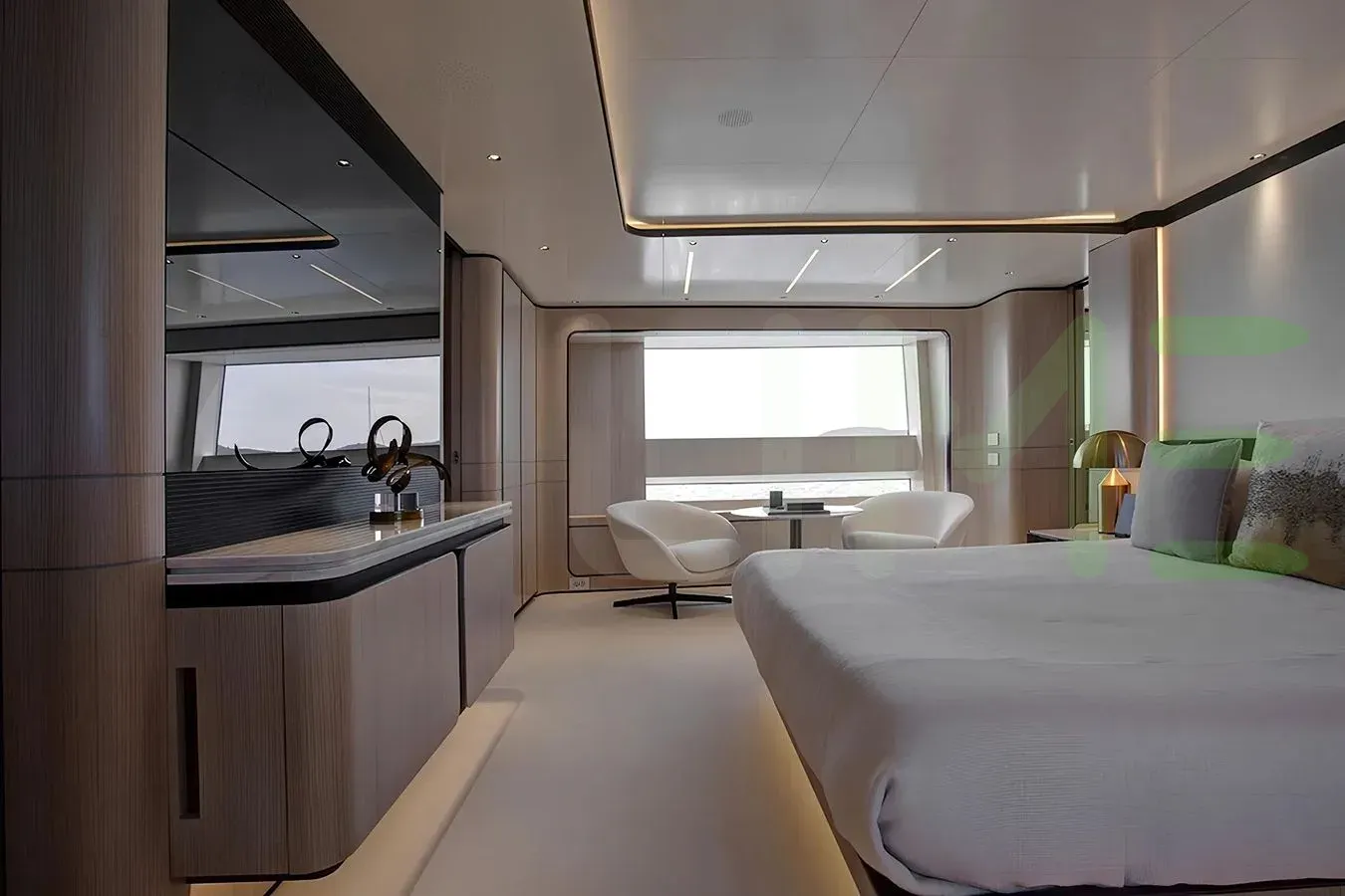 With a gross tonnage of 411, the PERLA BIANCA yacht for charter provides ample interior space for enjoyment. PERLA BIANCA offers accommodations for up to 10 guests in 5 lavishly appointed staterooms. She can also carry up to 9 crew onboard, including the Captain, to ensure a relaxed luxury yacht charter experience. The interior design by Studio Vafiadis exudes a sense of luxury, seamlessly blending comfort with style.