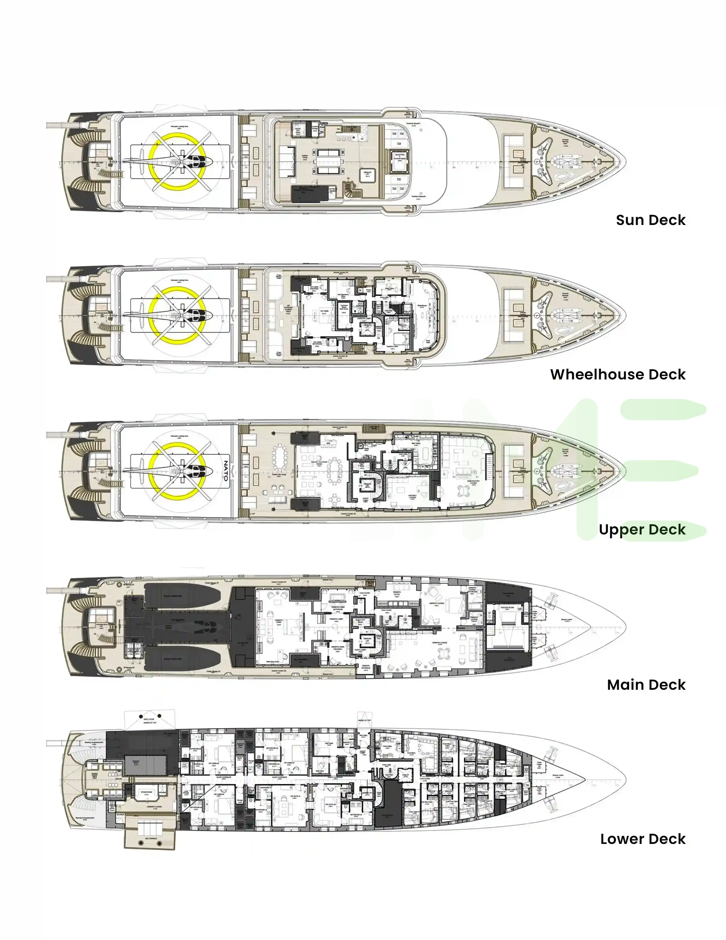 Request plans that include the layout of staterooms, guest areas, and outdoor spaces, as well as crew quarters and work areas.