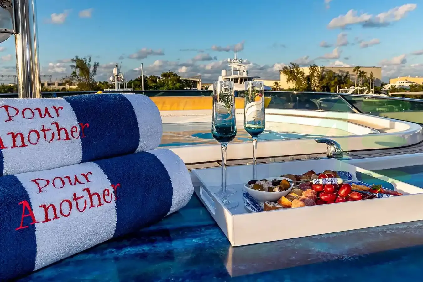 Indulge in the opulent comforts of spacious lounges, gourmet dining areas, and elegantly appointed staterooms. Savor the breathtaking views from the open decks, unwind on a sun lounge, or stay active in the water. For adventure enthusiasts, the POUR ANOTHER motoryacht is equipped with an array of water toys. Dive into the crystal-clear waters for a refreshing swim, explore hidden coves, or experience the thrill of wakeboarding. With attentive crew members catering to your every need, a yacht charter promises an unforgettable blend of relaxation, luxury, and adventure.