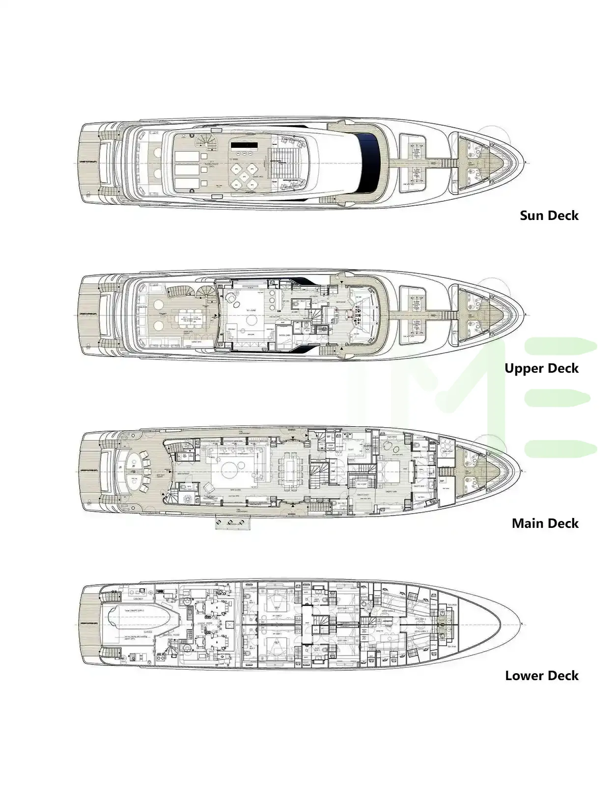 Request plans that include the layout of staterooms, guest areas, and outdoor spaces, as well as crew quarters and work areas.